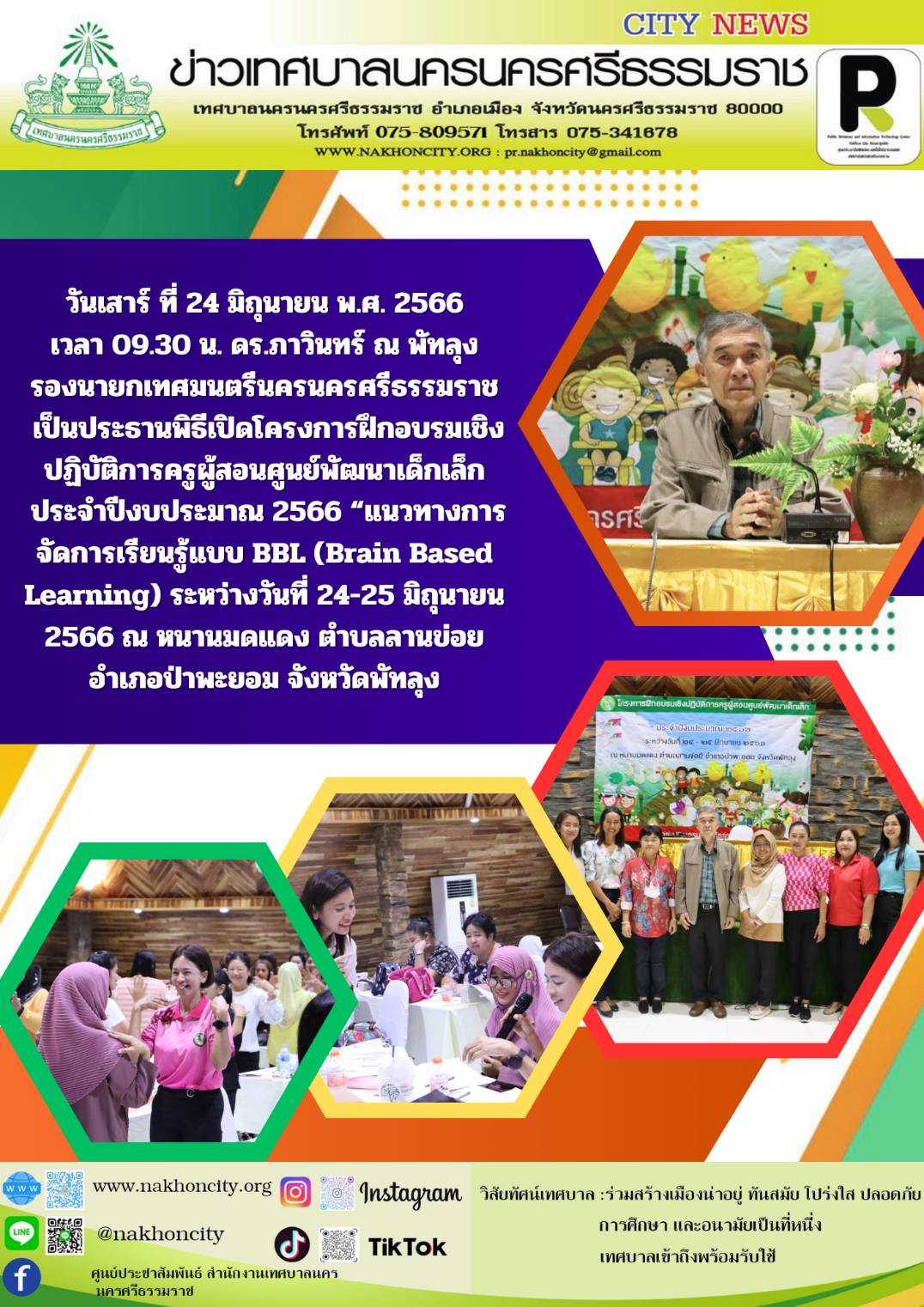 วันเสาร์ที่ 24 มิถุนายน พ.ศ. 2566 เวลา 09.30 น. ดร.ภาวินทร์ ณ พัทลุง รองนายกเทศมนตรีนครนครศรีธรรมราช เป็นประธานพิธีเปิดโครงการฝึกอบรมเชิงปฏิบัติการครูผู้สอนศูนย์พัฒนาเด็กเล็ก ประจำปีงบประมาณ 2566 “แนวทางการจัดการเรียนรู้แบบ BBL (Brain Based Learning) ระหว่างวันที่ 24-25 มิถุนายน 2566 ณ หนานมดแดง ตำบลลานข่อย อำเภอป่าพะยอม จังหวัดพัทลุง |