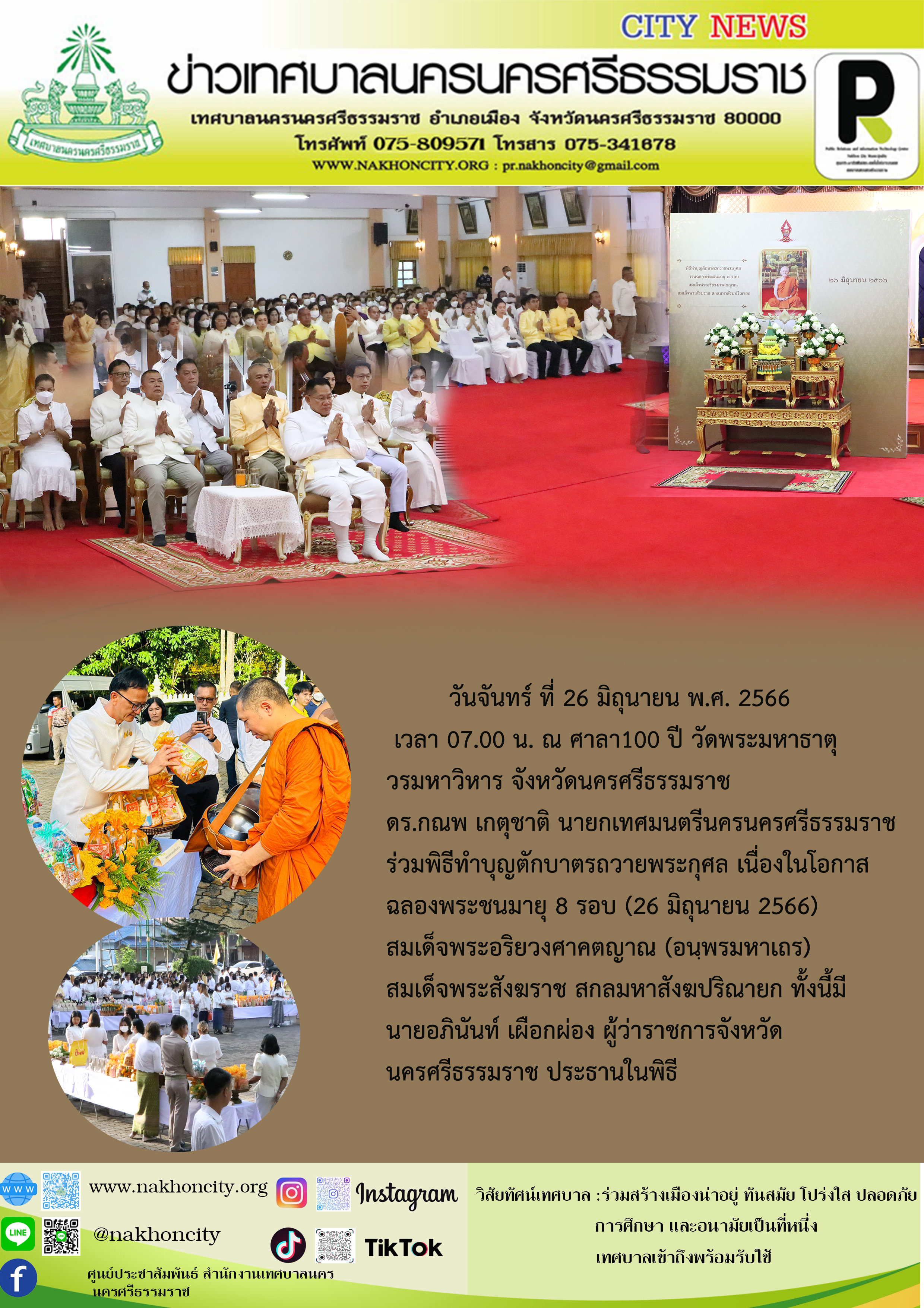 ดร.กณพ เกตุชาติ นายกเทศมนตรีนครนครศรีธรรมราช ร่วมพิธีทำบุญตักบาตรถวายพระกุศล เนื่องในโอกาสฉลองพระชนมายุ 8 รอบ (26 มิถุนายน 2566) สมเด็จพระอริยวงศาคตญาณ (อนฺพรมหาเถร) สมเด็จพระสังฆราช สกลมหาสังฆปริณายก |