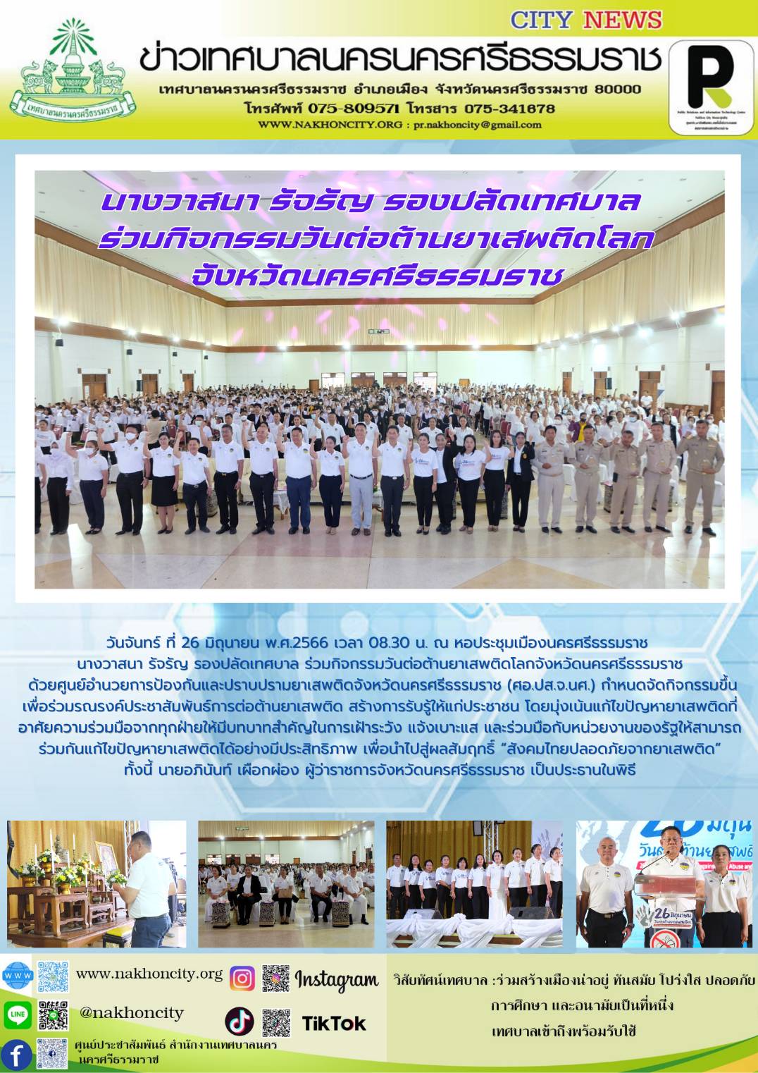 วันจันทร์ ที่ 26 มิถุนายน พ.ศ.2566 เวลา 08.30 น. ณ หอประชุมเมืองนครศรีธรรมราช นางวาสนา รัจรัญ รองปลัดเทศบาล ร่วมกิจกรรมวันต่อต้านยาเสพติดโลกจังหวัดนครศรีธรรมราช ด้วยศูนย์อำนวยการป้องกันและปราบปรามยาเสพติดจังหวัดนครศรีธรรมราช (ศอ.ปส.จ.นศ.) กำหนดจัดกิจกรรมขึ้น เพื่อร่วมรณรงค์ประชาสัมพันธ์การต่อต้านยาเสพติด สร้างการรับรู้ให้แก่ประชาชน โดยมุ่งเน้นแก้ไขปัญหายาเสพติดที่อาศัยความร่วมมือจากทุกฝ่ายให้มีบทบาทสำคัญในการเฝ้าระวัง แจ้งเบาะแส และร่วมมือกับหน่วยงานของรัฐให้สามารถร่วมกันแก้ไขปัญหายาเสพติดได้อย่างมีประสิทธิภาพ เพื่อนำไปสู่ผลสัมฤทธิ์ “สังคมไทยปลอดภัยจากยาเสพติด” ทั้งนี้ นายอภินันท์ เผือกผ่อง ผู้ว่าราชการจังหวัดนครศรีธรรมราช เป็นประธานในพิธี ..................... ภาพ//ข่าว//จันทร์จิรา ตรวจทาน//ฐิตินันท์ |