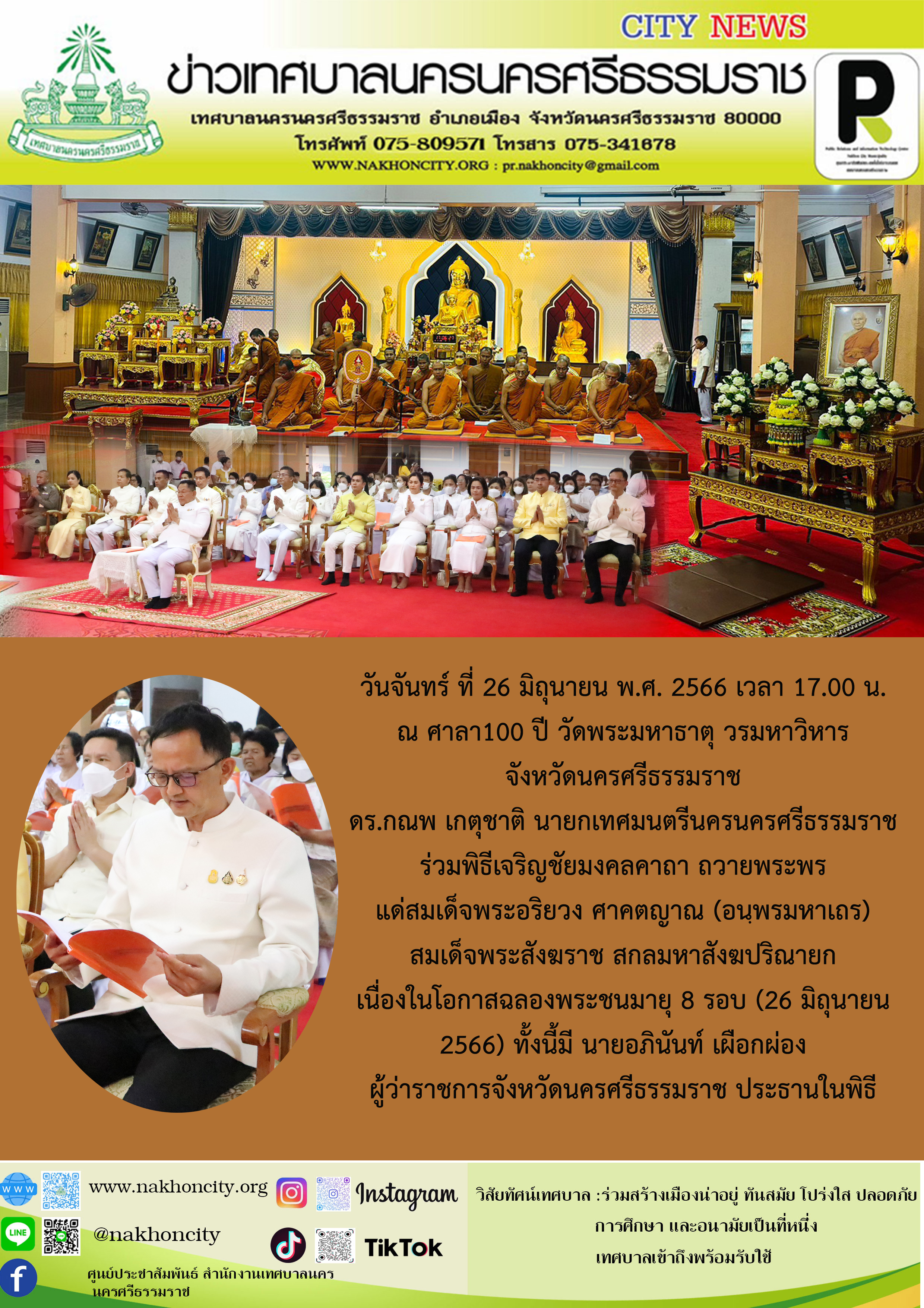 ดร.กณพ เกตุชาติ นายกเทศมนตรีนครนครศรีธรรมราช ร่วมพิธีเจริญชัยมงคลคาถา ถวายพระพร แด่สมเด็จพระอริยวงศาคตญาณ (อนฺพรมหาเถร) สมเด็จพระสังฆราช สกลมหาสังฆปริณายก เนื่องในโอกาสฉลองพระชนมายุ 8 รอบ (26 มิถุนายน 2566) |