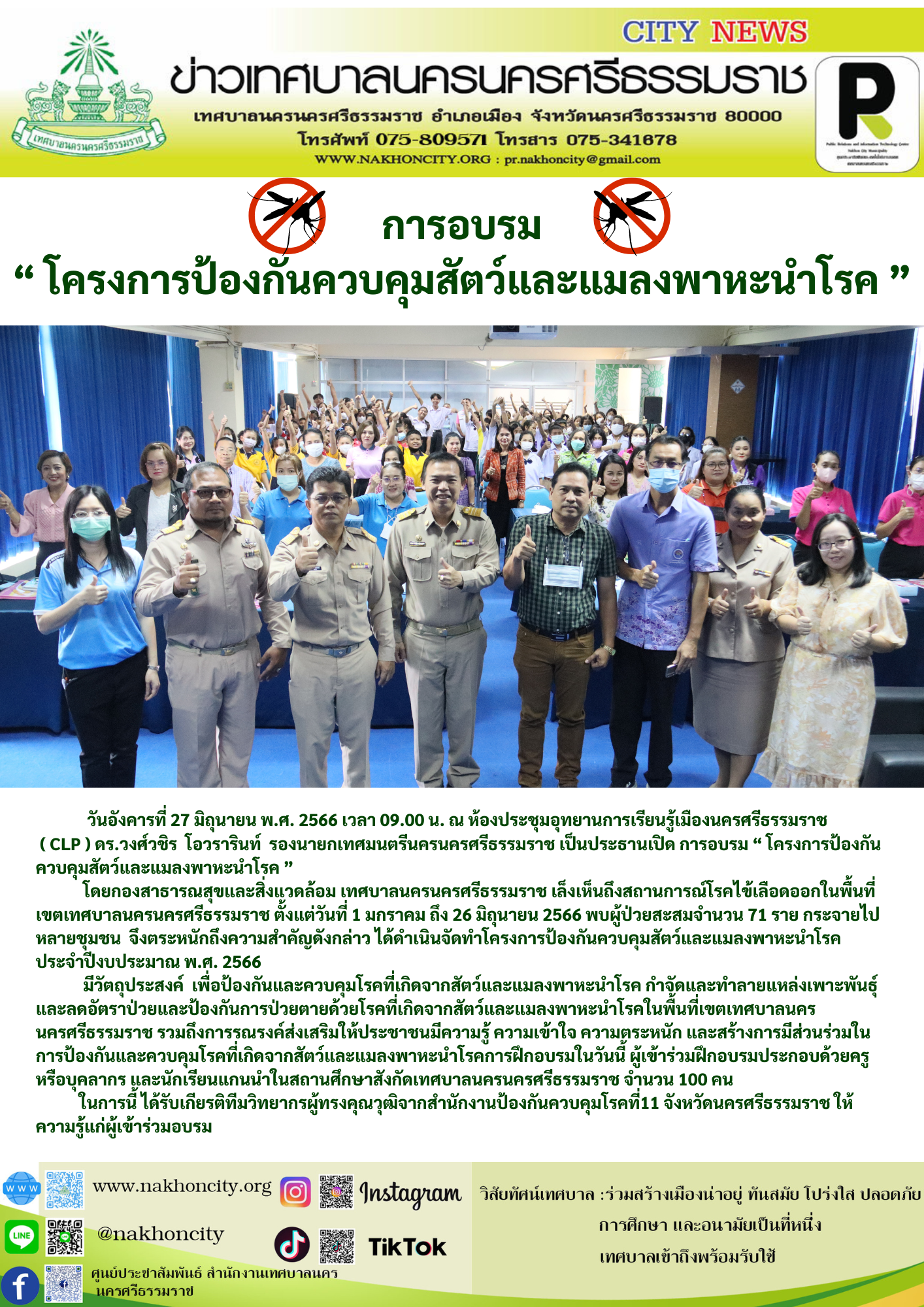 วันอังคารที่ 27 มิถุนายน พ.ศ. 2566 เวลา 09.00 น. ณ ห้องประชุมอุทยานการเรียนรู้เมืองนครศรีรรมราช ( CLP ) ดร.วงศ์วชิร โอวรารินท์ รองนายกเทศมนตรีนครนครศรีธรรมราช เป็นประธานเปิด การอบรม “ โครงการป้องกันควบคุมสัตว์และแมลงพาหะนำโรค ” โดยกองสาธารณสุขและสิ่งแวดล้อม เทศบาลนครนครศรีธรรมราช เล็งเห็นถึงสถานการณ์โรคไข้เลือดออกในพื้นที่เขตเทศบาลนครนครศรีธรรมราช ตั้งแต่วันที่ 1 มกราคม ถึง 26 มิถุนายน 2566 พบผู้ป่วยสะสมจำนวน 71 ราย กระจายไปหลายชุมชน จึงตระหนักถึงความสำคัญดังกล่าว ได้ดำเนินจัดทำโครงการป้องกันควบคุมสัตว์และแมลงพาหะนำโรค ประจำปีงบประมาณ พ.ศ. 2566 โดยมีวัตถุประสงค์ เพื่อป้องกันและควบคุมโรคที่เกิดจากสัตว์และแมลงพาหะนำโรค กำจัดและทำลาย แหล่งเพาะพันธุ์ และลดอัตราป่วยและป้องกันการป่วยตายด้วยโรคที่เกิดจากสัตว์และแมลงพาหะนำโรคในพื้นที่เขตเทศบาลนครนครศรีธรรมราช รวมถึงการรณรงค์ส่งเสริมให้ประชาชนมีความรู้ ความเข้าใจ ความตระหนัก และสร้างการมีส่วนร่วมในการป้องกันและควบคุมโรคที่เกิดจากสัตว์และแมลงพาหะนำโรค การฝึกอบรมในวันนี้ ผู้เข้าร่วมฝึกอบรมประกอบด้วยครูหรือบุคลากร และนักเรียนแกนนำในสถานศึกษาสังกัดเทศบาลนครนครศรีธรรมราช จำนวน 100 คน ในการนี้ ได้รับเกียรติทีมวิทยากรผู้ทรงคุณวุฒิจากสำนักงานป้องกันควบคุมโรคที่11 จังหวัดนครศรีธรรมราช ให้ความรู้แก่ผู้เข้าร่วมอบรม