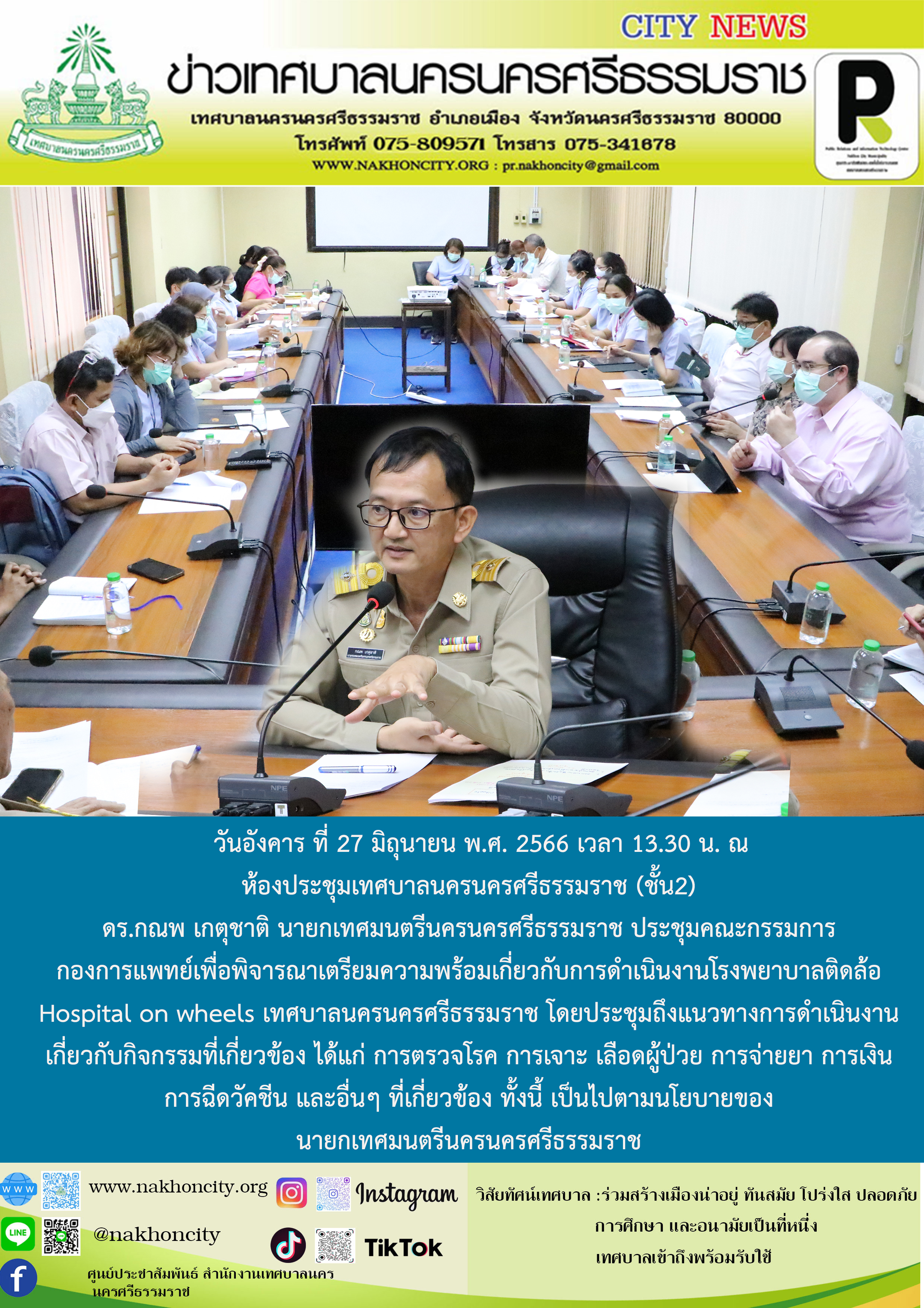 ดร.กณพ เกตุชาติ นายกเทศมนตรีนครนครศรีธรรมราช ประชุมคณะกรรมการกองการแพทย์เพื่อพิจารณาเตรียมความพร้อมเกี่ยวกับการดำเนินงานโรงพยาบาลติดล้อ Hospital on wheels เทศบาลนครนครศรีธรรมราช |