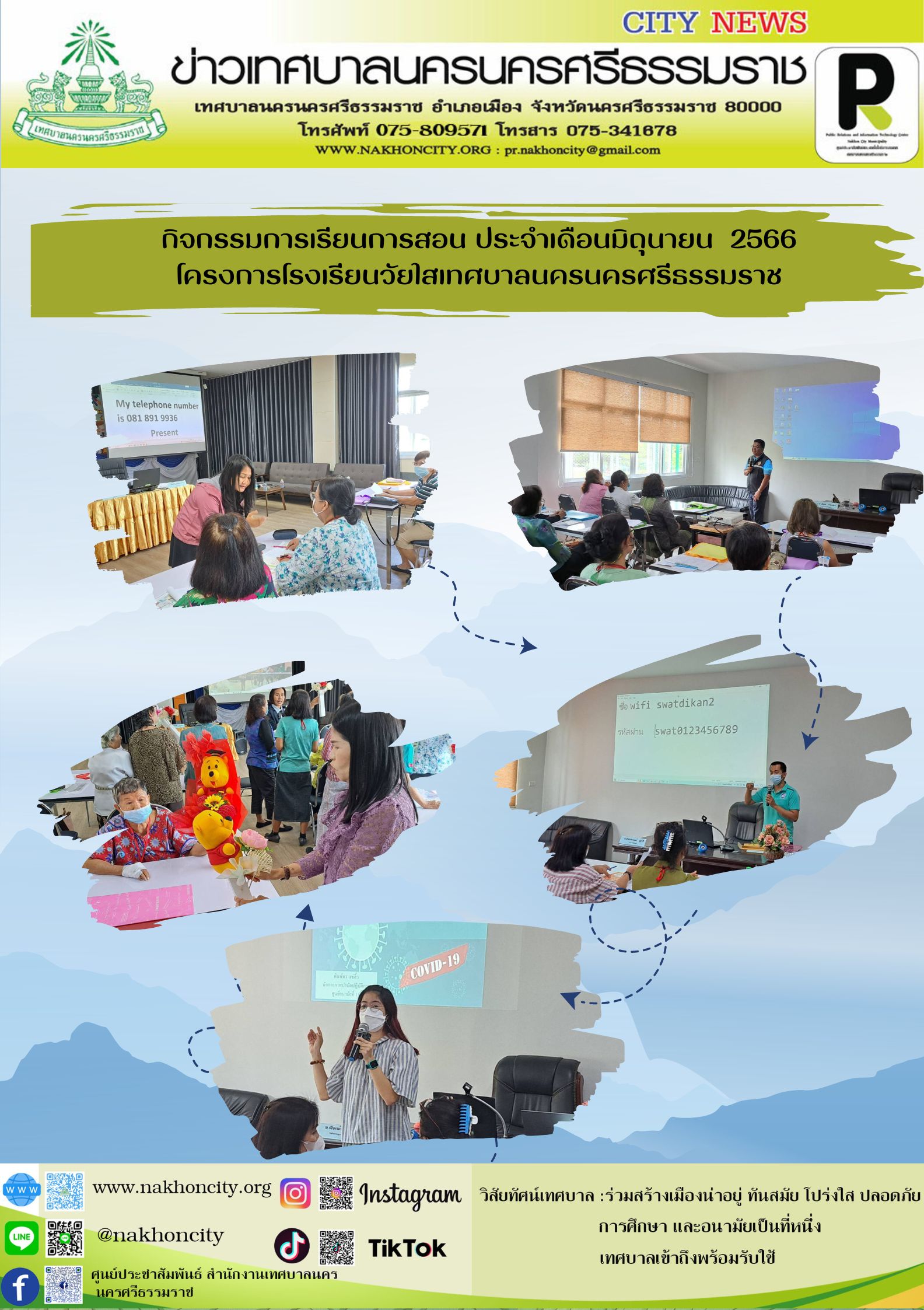 เทศบาลนครนครศรีธรรมราช ภายใต้การบริหารงาน โดย ดร.กณพ เกตุชาติ นายกเทศมนตรีนครนครศรีธรรมราช โดยกองสวัสดิการสังคม ฝ่ายสังคมสงเคราะห์ เทศบาลนครนครศรีธรรมราช จัดกิจกรรมการเรียนการสอน ประจำเดือนมิถุนายน 2566 โครงการโรงเรียนวัยใส เทศบาลนครนครศรีธรรมราช ทุกวันอังคารและวันพุธ เวลา 09:00-15:00 น. ณ ห้องประชุม ชั้น 2 กองสวัสดิการสังคม เทศบาลนครนครศรีธรรมราช ประกอบด้วยรายวิชาต่าง ๆ เช่น คุณธรรมจริยธรรม การดูแลรักษาสุขภาพ ภาษาต่างประเทศ งานประดิษฐ์ ให้ผู้สูงอายุจำนวน 30 คน ตามโครงการโรงเรียนวัยใส เทศบาลนครนครศรีธรรมราช การจัดกิจกรรมในครั้งนี้วัตถุประสงค์เพื่อพัฒนาศักยภาพของผู้สูงอายุด้วยการส่งเสริมให้มีส่วนร่วมในกิจกรรมทางสังคม และการเรียนรู้ตลอดชีวิต ในรูปแบบของโรงเรียนผู้สูงอายุ ณ ห้องประชุมมวลชนสัมพันธ์ ชั้น 2 อาคารกองสวัสดิการสังคม เทศบาลนครนครศรีธรรมราช สวนสาธารณะสวนสมเด็จพระศรีนครินทร์ ‘84 (ทุ่งท่าลาด)