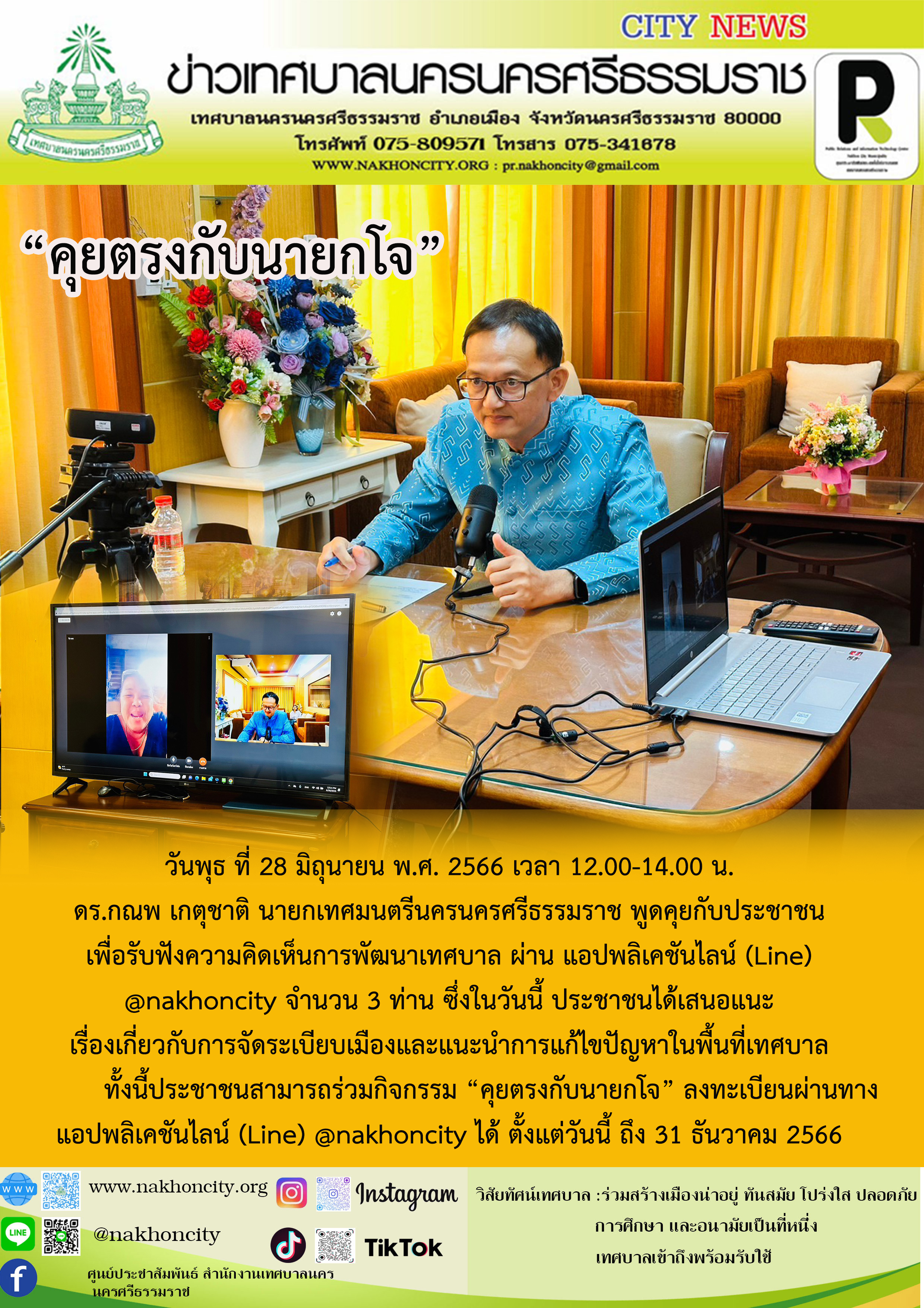วันพุธ ที่ 28 มิถุนายน พ.ศ. 2566 เวลา 12.00-14.00 น. ดร.กณพ เกตุชาติ นายกเทศมนตรีนครนครศรีธรรมราช พูดคุยกับประชาชน เพื่อรับฟังความคิดเห็นการพัฒนาเทศบาล ผ่าน แอปพลิเคชันไลน์ (Line) @nakhoncity จำนวน 3 ท่าน ซึ่งในวันนี้ ประชาชนได้เสนอแนะ เรื่องเกี่ยวกับการจัดระเบียบเมืองและแนะนำการแก้ไขปัญหาในพื้นที่เทศบาล