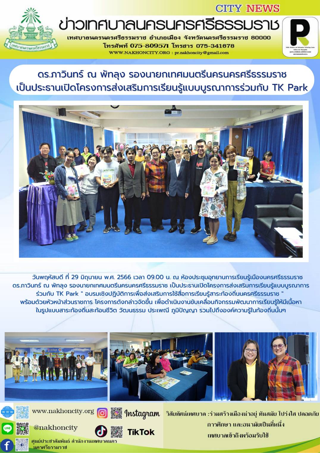 วันพฤหัสบดี ที่ 29 มิถุนายน พ.ศ. 2566 เวลา 09.00 น. ณ ห้องประชุมอุทยานการเรียนรู้เมืองนครศรีธรรมราช ดร.ภาวินทร์ ณ พัทลุง รองนายกเทศมนตรีนครนครศรีธรรมราช เป็นประธานเปิดโครงการส่งเสริมการเรียนรู้แบบบูรณาการร่วมกับ TK Park " อบรมเชิงปฏิบัติการเพื่อส่งเสริมการใช้สื่อการเรียนรู้สาระท้องถิ่นนครศรีธรรมราช " พร้อมด้วยหัวหน้าส่วนราชการ โครงการดังกล่าวจัดขึ้น เพื่อดำเนินงานขับเคลื่อนกิจกรรมพัฒนาการเรียนรู้ให้มีเนื้อหาในรูปแบบสาระท้องถิ่นสะท้อนชีวิต วัฒนธรรม ประเพณี ภูมิปัญญา รวมไปถึงองค์ความรู้ในท้องถิ่นนั้นๆ |