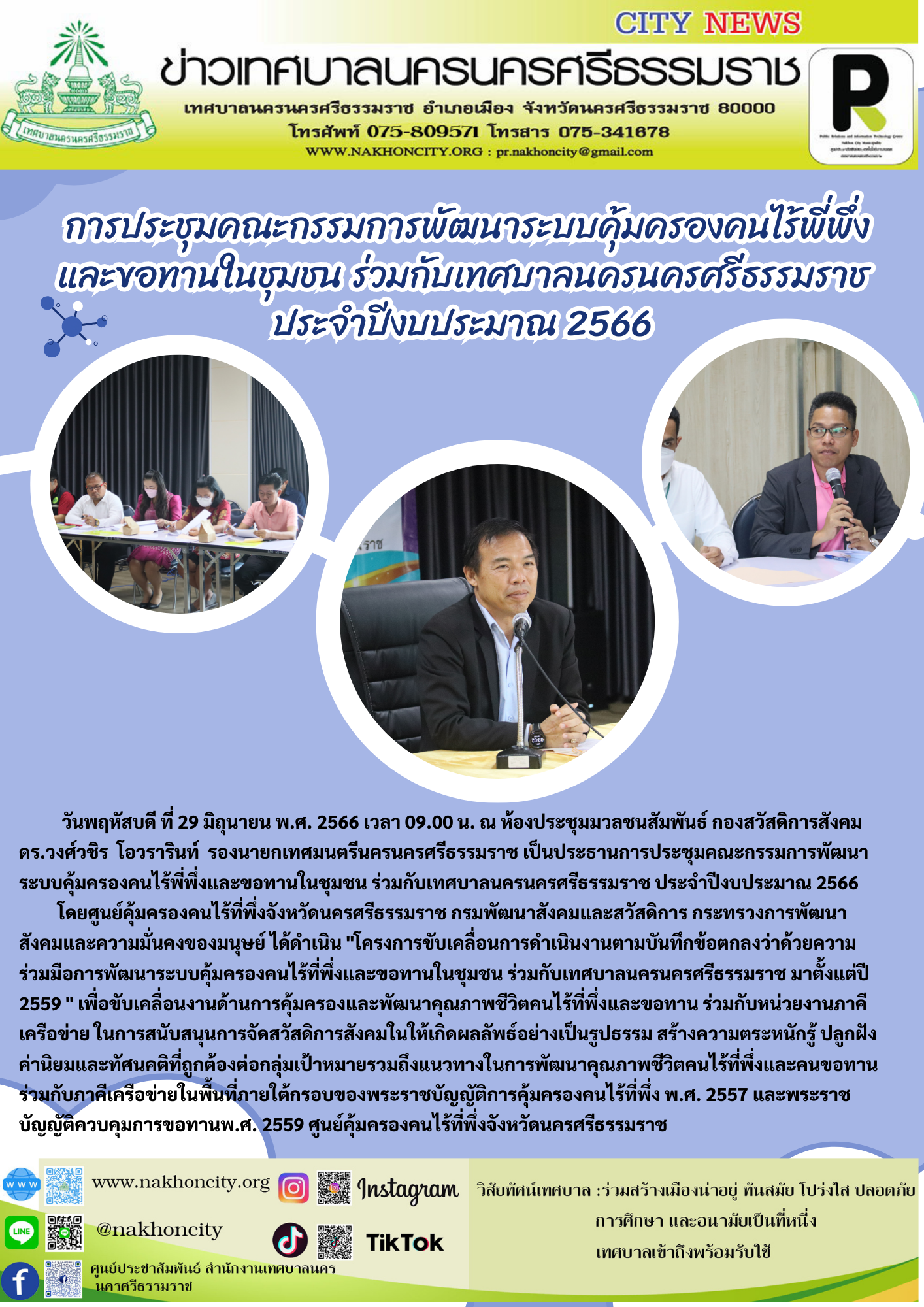 ดร.วงศ์วชิร โอวรารินท์ รองนายกเทศมนตรีนครนครศรีธรรมราช เป็นประธานการประชุมคณะกรรมการพัฒนาระบบคุ้มครองคนไร้ที่พึ่งและขอทานในชุมชน ร่วมกับเทศบาลนครนครศรีธรรมราช ประจำปีงบประมาณ 2566 |