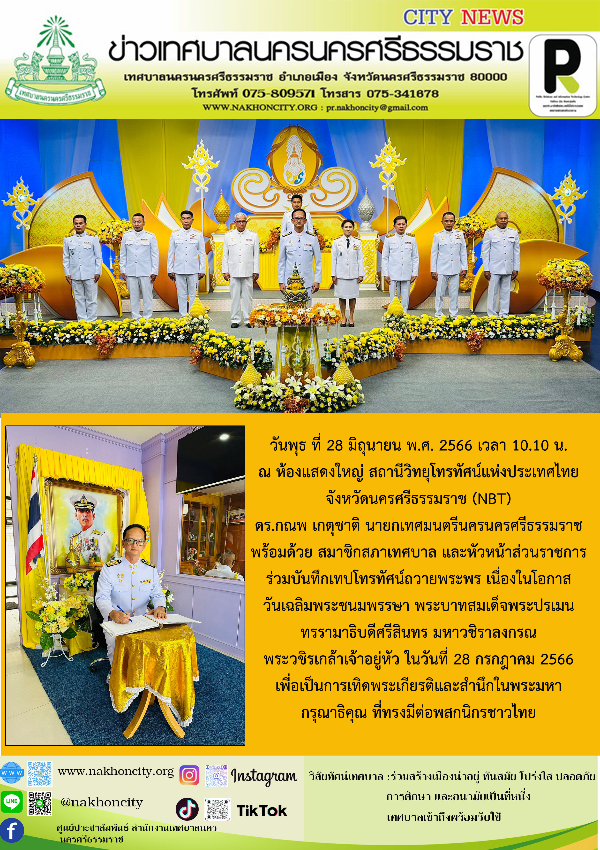ดร.กณพ เกตุชาติ นายกเทศมนตรีนครนครศรีธรรมราช พร้อมด้วย สมาชิกสภาเทศบาล และหัวหน้าส่วนราชการ ร่วมบันทึกเทปโทรทัศน์ถวายพระพร เนื่องในโอกาสวันเฉลิมพระชนมพรรษา พระบาทสมเด็จพระปรเมนทรรามาธิบดีศรีสินทร มหาวชิราลงกรณ พระวชิรเกล้าเจ้าอยู่หัว ในวันที่ 28 กรกฎาคม 2566 |