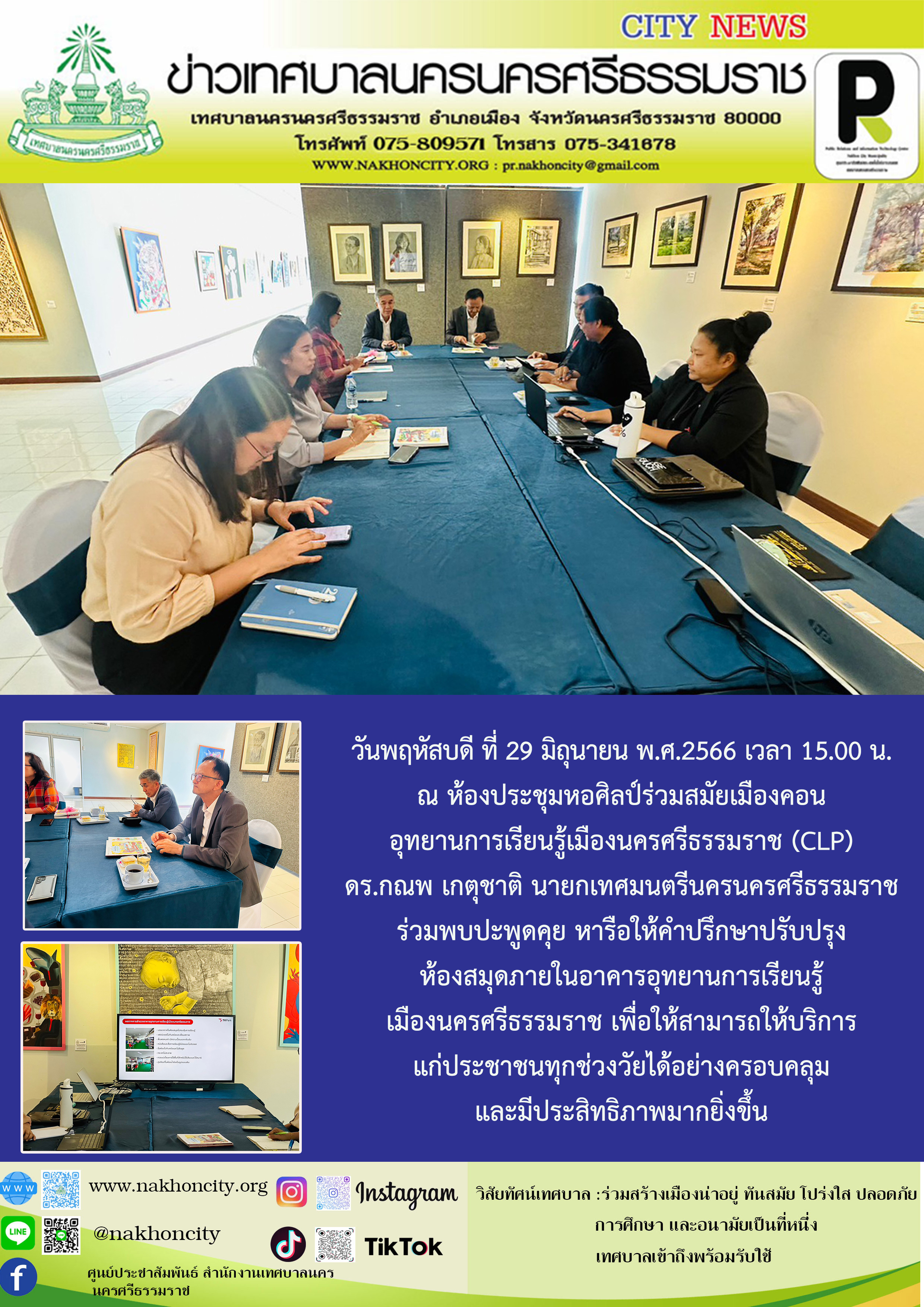 ดร.กณพ เกตุชาติ นายกเทศมนตรีนครนครศรีธรรมราช ร่วมพบปะพูดคุย หารือให้คำปรึกษาปรับปรุงห้องสมุดภายในอาคารอุทยานการเรียนรู้เมืองนครศรีธรรมราช เพื่อให้สามารถให้บริการแก่ประชาชนทุกช่วงวัยได้อย่างครอบคลุมและมีประสิทธิภาพมากยิ่งขึ้น |
