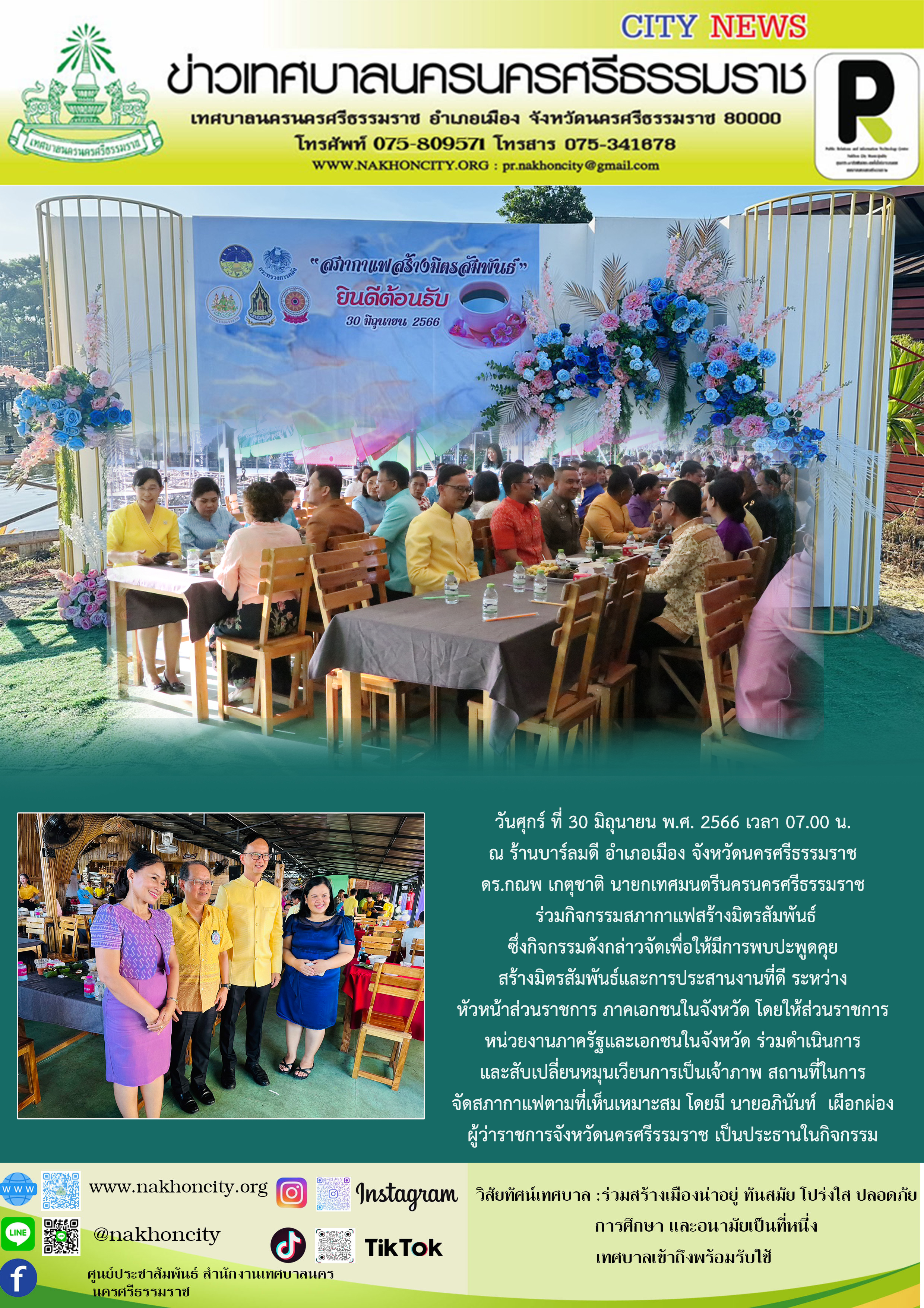 ดร.กณพ เกตุชาติ นายกเทศมนตรีนครนครศรีธรรมราช ร่วมกิจกรรมสภากาแฟสร้างมิตรสัมพันธ์ ซึ่งกิจกรรมดังกล่าวจัดเพื่อให้มีการพบปะพูดคุย สร้างมิตรสัมพันธ์และการประสานงานที่ดี ระหว่างหัวหน้าส่วนราชการ ภาคเอกชนในจังหวัด |