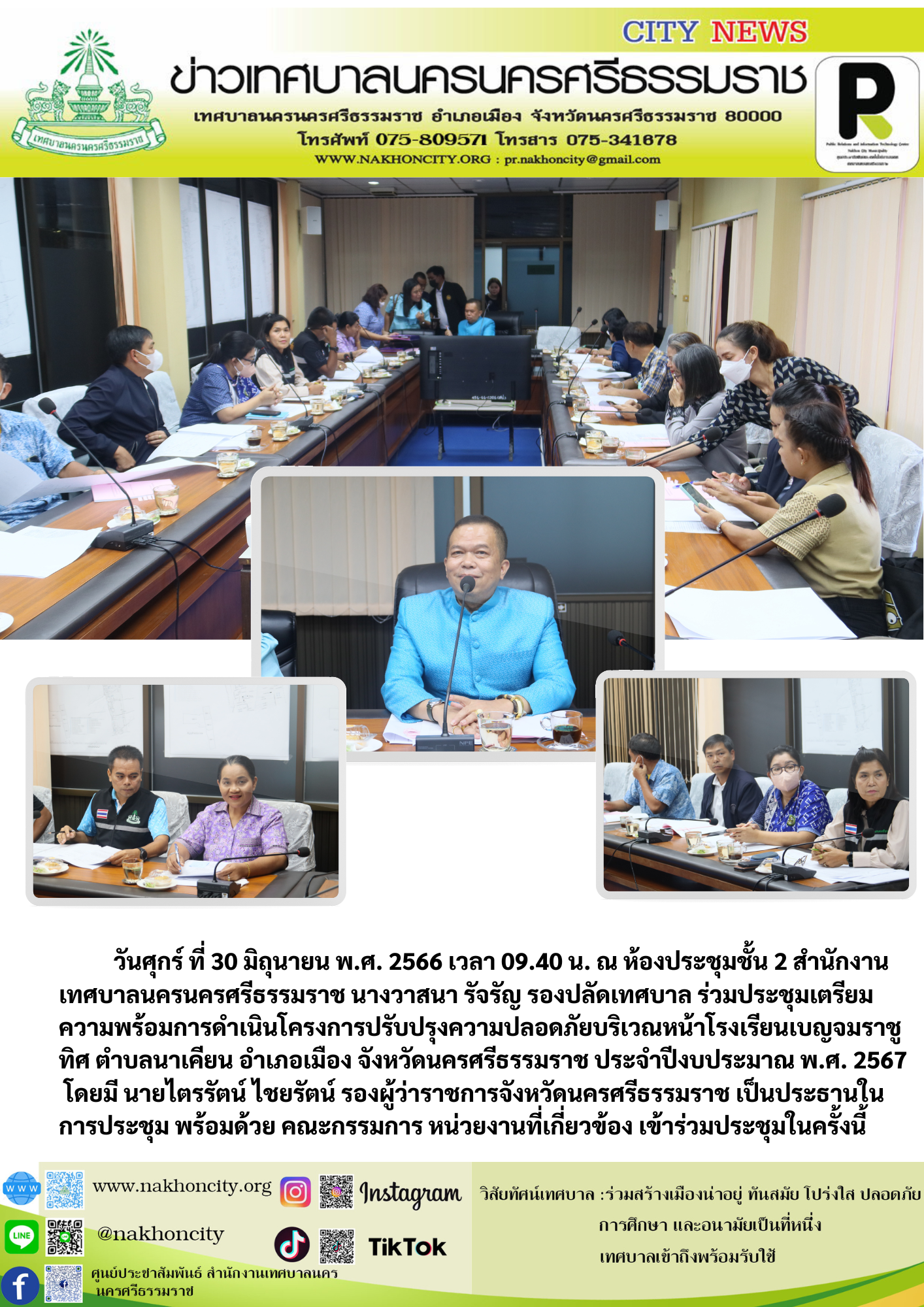 วันศุกร์ ที่ 30 มิถุนายน พ.ศ. 2566 เวลา 09.40 น. ณ ห้องประชุมชั้น 2 สำนักงานเทศบาลนครนครศรีธรรมราช นางวาสนา รัจรัญ รองปลัดเทศบาล ร่วมประชุมเตรียมความพร้อมการดำเนินโครงการปรับปรุงความปลอดภัยบริเวณหน้าโรงเรียนเบญจมราชูทิศ ตำบลนาเคียน อำเภอเมือง จังหวัดนครศรีธรรมราช ประจำปีงบประมาณ พ.ศ. 2567 โดยมี นายไตรรัตน์ ไชยรัตน์ รองผู้ว่าราชการจังหวัดนครศรีธรรมราช เป็นประธานในการประชุม พร้อมด้วย คณะกรรมการ หน่วยงานที่เกี่ยวข้อง เข้าร่วมประชุมในครั้งนี้