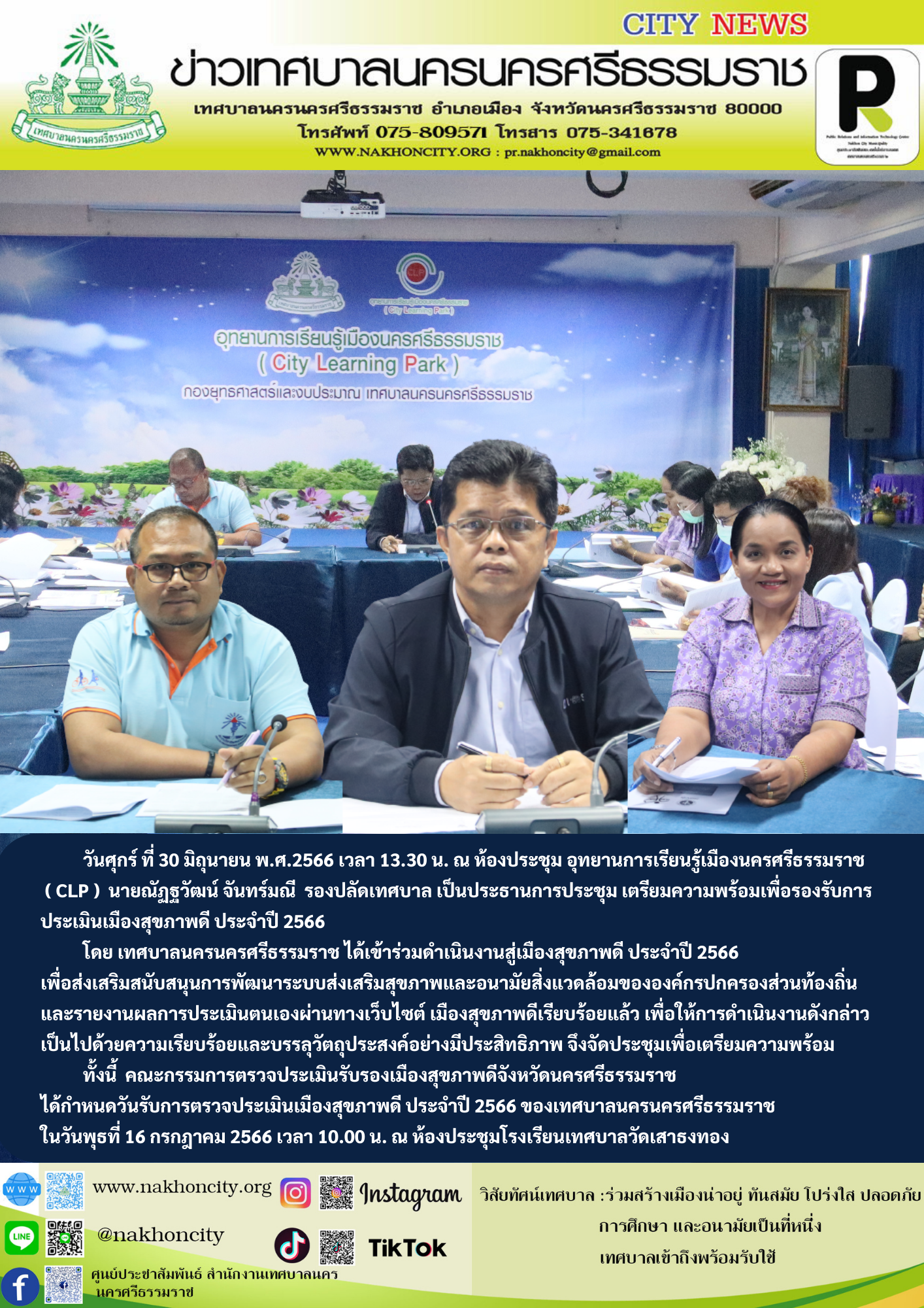 วันศุกร์ ที่ 30 มิถุนายน พ.ศ.2566 เวลา 13.30 น. ณ ห้องประชุม อุทยานการเรียนรู้เมืองนครศรีธรรมราช ( CLP ) นายณัฏฐวัฒน์ จันทร์มณี รองปลัดเทศบาล เป็นประธานการประชุม เตรียมความพร้อมเพื่อรองรับการประเมินเมืองสุขภาพดี ประจำปี 2566 โดย เทศบาลนครนครศรีธรรมราช ได้เข้าร่วมดำเนินงานสู่เมืองสุขภาพดี ประจำปี 2566 เพื่อส่งเสริมสนับสนุนการพัฒนาระบบส่งเสริมสุขภาพและอนามัยสิ่งแวดล้อมขององค์กรปกครองส่วนท้องถิ่นและรายงานผลการประเมินตนเองผ่านทางเว็บไซต์ เมืองสุขภาพดีเรียบร้อยแล้ว เพื่อให้การดำเนินงานดังกล่าวเป็นไปด้วยความเรียบร้อยและบรรลุวัตถุประสงค์อย่างมีประสิทธิภาพ จึงจัดประชุมเพื่อเตรียมความพร้อม ทั้งนี้ คณะกรรมการตรวจประเมินรับรองเมืองสุขภาพดีจังหวัดนครศรีธรรมราช ได้กำหนดวันรับการตรวจประเมินเมืองสุขภาพดี ประจำปี 2566 ของเทศบาลนครนครศรีธรรมราช ในวันพุธที่ 16 กรกฎาคม 2566 เวลา 10.00 น. ณ ห้องประชุมโรงเรียนเทศบาลวัดเสาธงทอง |