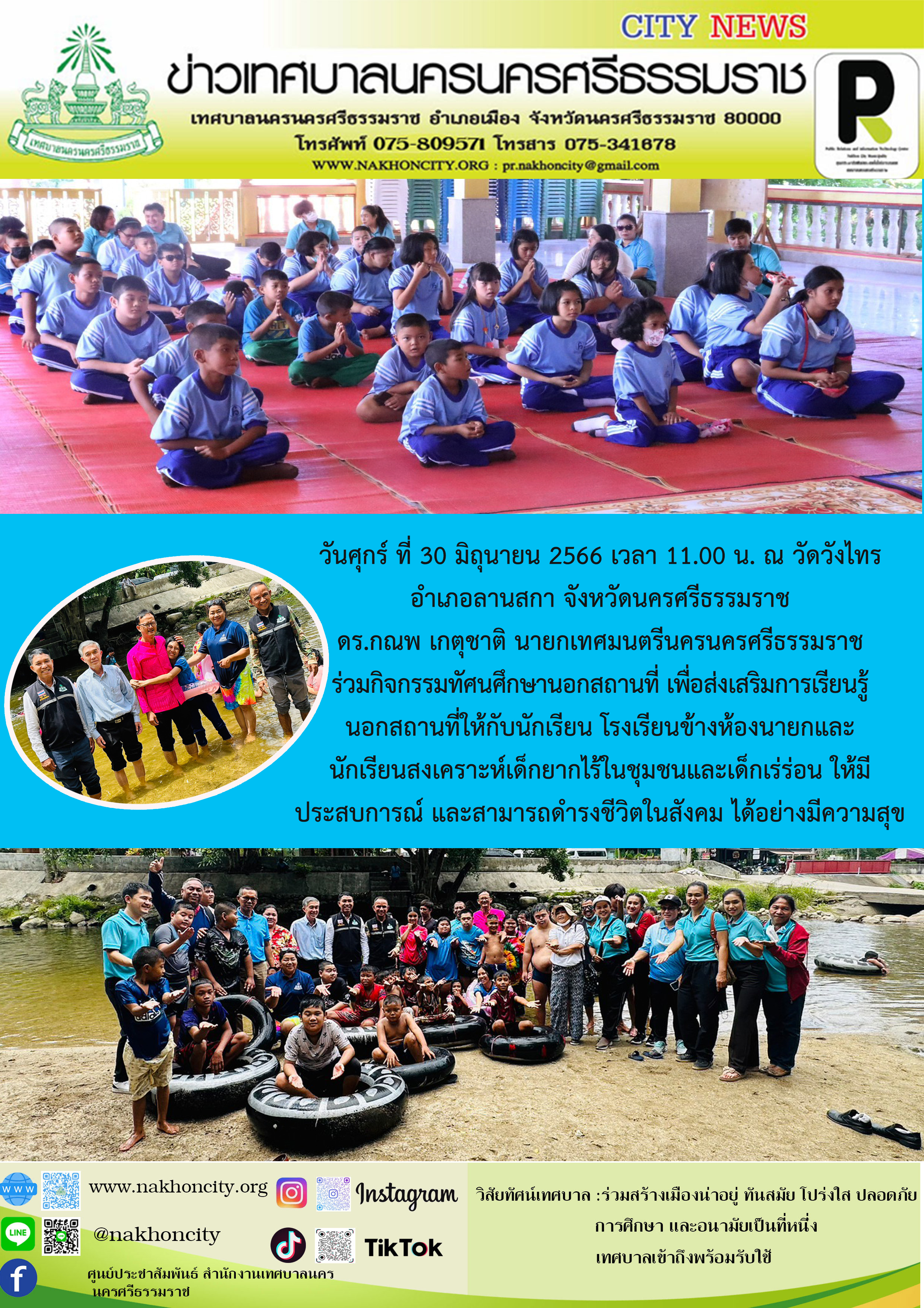 ดร.กณพ เกตุชาติ นายกเทศมนตรีนครนครศรีธรรมราช ร่วมกิจกรรมทัศนศึกษานอกสถานที่ เพื่อส่งเสริมการเรียนรู้นอกสถานที่ให้กับนักเรียนโรงเรียนข้างห้องนายกและนักเรียนสงเคราะห์เด็กยากไร้ในชุมชนและเด็กเร่ร่อน ให้มีประสบการณ์ และสามารถดำรงชีวิตในสังคมได้อย่างมีความสุข |