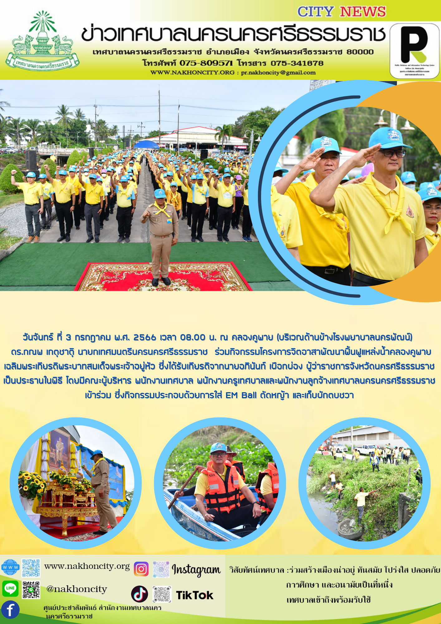 วันจันทร์ ที่ 3 กรกฎาคม พ.ศ. 2566 เวลา 08.00 น. ณ คลองคูพาย (บริเวณด้านข้างโรงพยาบาลนครพัฒน์) ดร.กณพ เกตุชาตุิ นายกเทศมนตรีนครนครศรีธรรมราช ร่วมกิจกรรมโครงการจิตอาสาพัฒนาฟื้นฟูแหล่งน้ำคลองคูพาย เฉลิมพระเกียรติพระบาทสมเด็จพระเจ้าอยู่หัว ซึ่งได้รับเกียรติจากนายอภินันท์ เผือกผ่อง ผู้ว่าราชการจังหวัดนครศรีธรรมราช เป็นประธานในพิธี โดยมีคณะผู้บริหาร พนักงานเทศบาล พนักงานครูเทศบาลและพนักงานลูกจ้างเทศบาลนครนครศรีธรรมราชเข้าร่วม ซึ่งกิจกรรมประกอบด้วยการใส่ EM Ball ตัดหญ้า และเก็บผักตบชวา .............. ภาพ//ข่าว//จันทร์จิรา ตรวจทาน//ฐิตินันท์ |