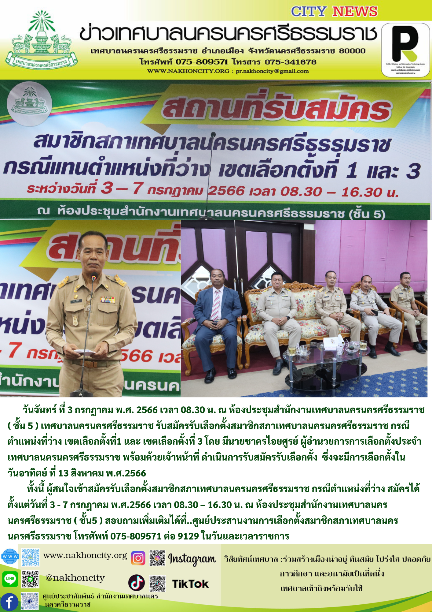 วันจันทร์ ที่ 3 กรกฎาคม พ.ศ. 2566 เวลา 08.30 น. ณ ห้องประชุมสำนักงานเทศบาลนครนครศรีรธรรมราช ( ชั้น 5 ) เทศบาลนครนครศรีธรรมราช รับสมัครรับเลือกตั้งสมาชิกสภาเทศบาลนครนครศรีธรรมราช กรณีตำแหน่งที่ว่าง เขตเลือกตั้งที่1 และ เขตเลือกตั้งที่ 3 โดย มีนายชาคร ไอยศูรย์ ผู้อำนวยการการเลือกตั้งประจำเทศบาลนครนครศรีธรรมราช พร้อมด้วยเจ้าหน้าที่ ดำเนินการรับสมัครรับเลือกตั้ง ซึ่งจะมีการเลือกตั้งในวันอาทิตย์ ที่ 13 สิงหาคม พ.ศ.2566 ทั้งนี้ ผู้สนใจเข้าสมัครรับเลือกตั้งสมาชิกสภาเทศบาลนครนครศรีธรรมราช กรณีตำแหน่งที่ว่าง สมัครได้ตั้งแต่วันที่ 3 - 7 กรกฎาคม พ.ศ.2566 เวลา 08.30 – 16.30 น. ณ ห้องประชุมสำนักงานเทศบาลนครนครศรีธรรมราช ( ชั้น5 ) สอบถามเพิ่มเติมได้ที่..ศูนย์ประสานงานการเลือกตั้งสมาชิกสภาเทศบาลนครนครศรีธรรมราช โทรศัพท์ 075-809571 ต่อ 9129 ในวันและเวลาราชการ