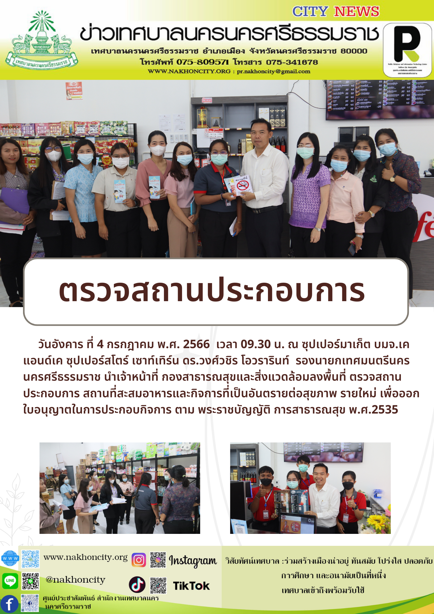 ดร.วงศ์วชิร โอวรารินท์ รองนายกเทศมนตรีนครนครศรีธรรมราช นำเจ้าหน้าที่ กองสาธารณสุขและสิ่งแวดล้อมลงพื้นที่ ตรวจสถานประกอบการ |