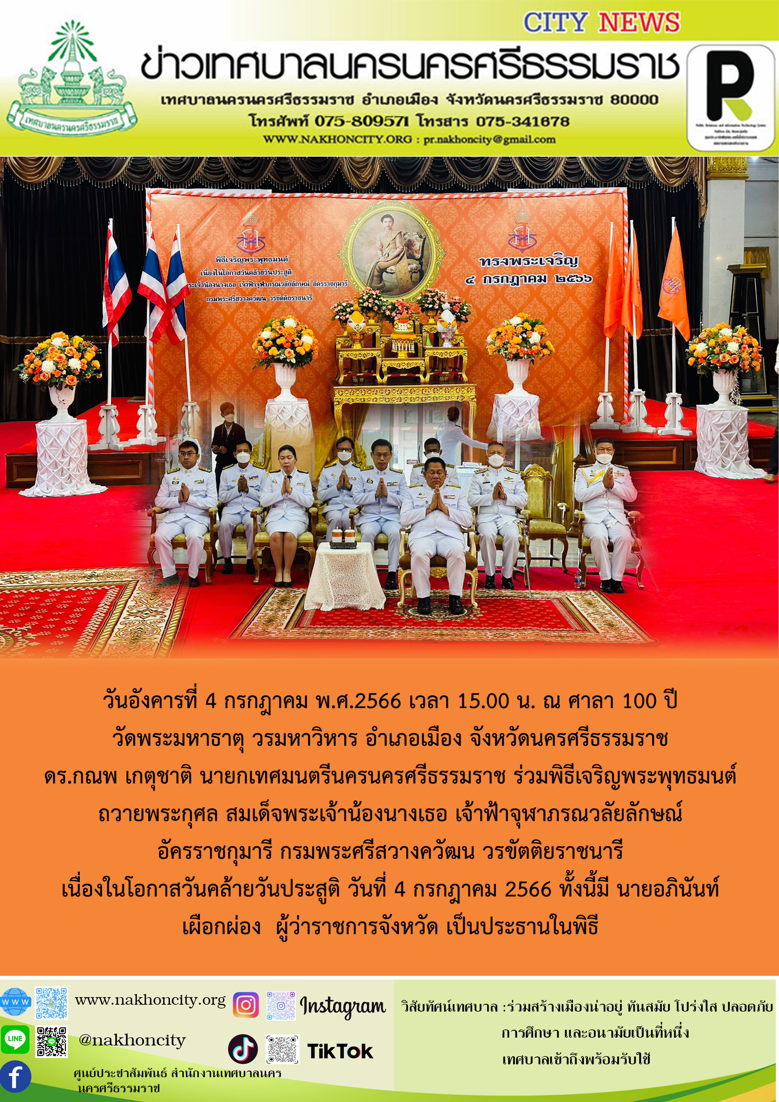 ดร.กณพ เกตุชาติ นายกเทศมนตรีนครนครศรีธรรมราช ร่วมพิธีเจริญพระพุทธมนต์ ถวายพระกุศล สมเด็จพระเจ้าน้องนางเธอ เจ้าฟ้าจุฬาภรณวลัยลักษณ์ อัครราชกุมารี กรมพระศรีสวางควัฒน วรขัตติยราชนารี เนื่องในโอกาสวันคล้ายวันประสูติ วันที่ 4 กรกฎาคม 2566 |