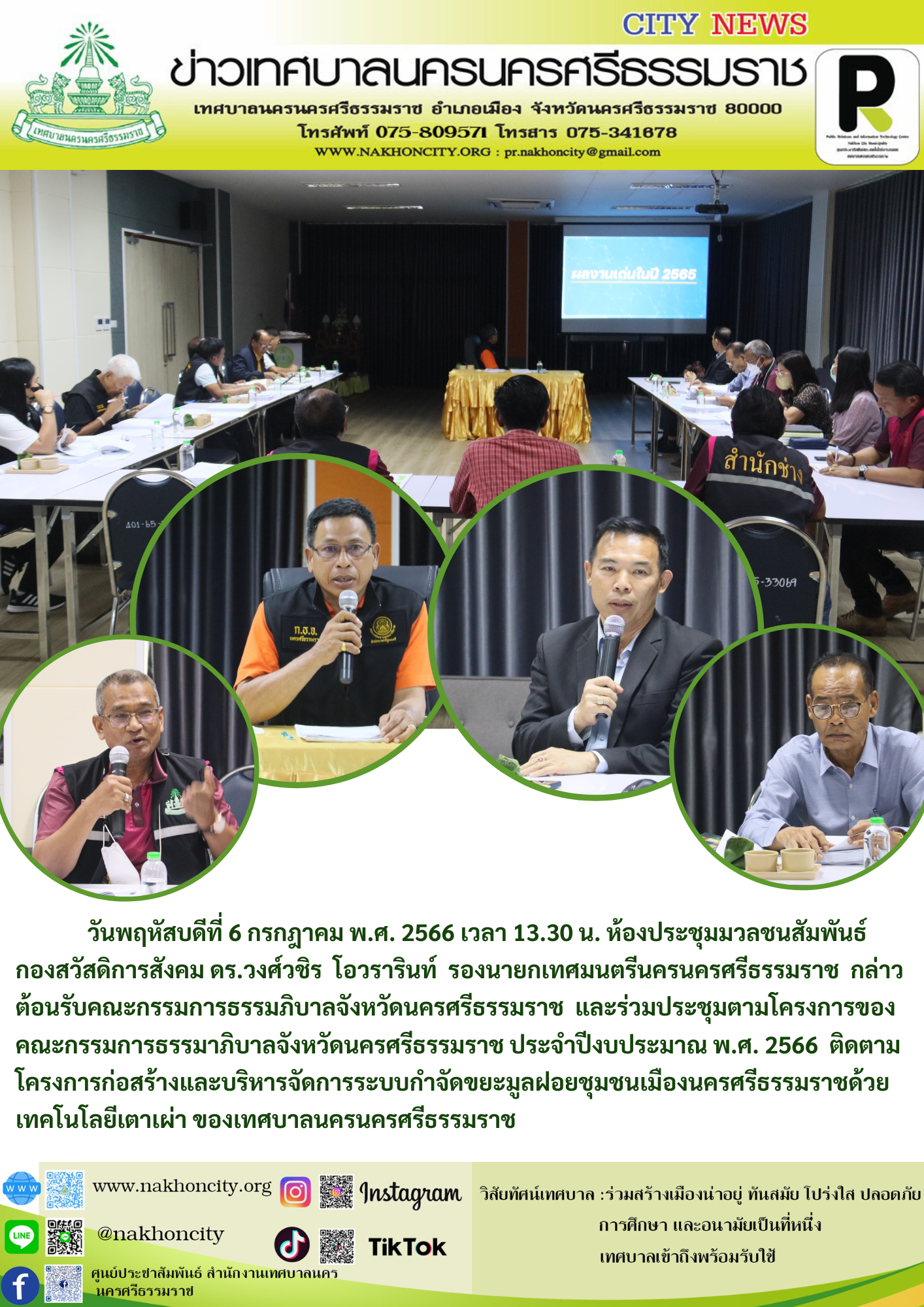 วันพฤหัสบดีที่ 6 กรกฎาคม พ.ศ. 2566 เวลา 13.30 น. ห้องประชุมมวลชนสัมพันธ์ (ชั้น 2 ) กองสวัสดิการสังคม ดร.วงศ์วชิร โอวรารินท์ รองนายกเทศมนตรีนครนครศรีธรรมราช กล่าวต้อนรับคณะกรรมการธรรมภิบาลจังหวัดนครศรีธรรมราช และร่วมประชุมตามโครงการของคณะกรรมการธรรมาภิบาลจังหวัดนครศรีธรรมราช ประจำปีงบประมาณ พ.ศ. 2566 ติดตามโครงการก่อสร้างและบริหารจัดการระบบกำจัดขยะมูลฝอยชุมชนเมืองนครศรีธรรมราชด้วยเทคโนโลยีเตาเผ่า ของเทศบาลนครนครศรีธรรมราช |
