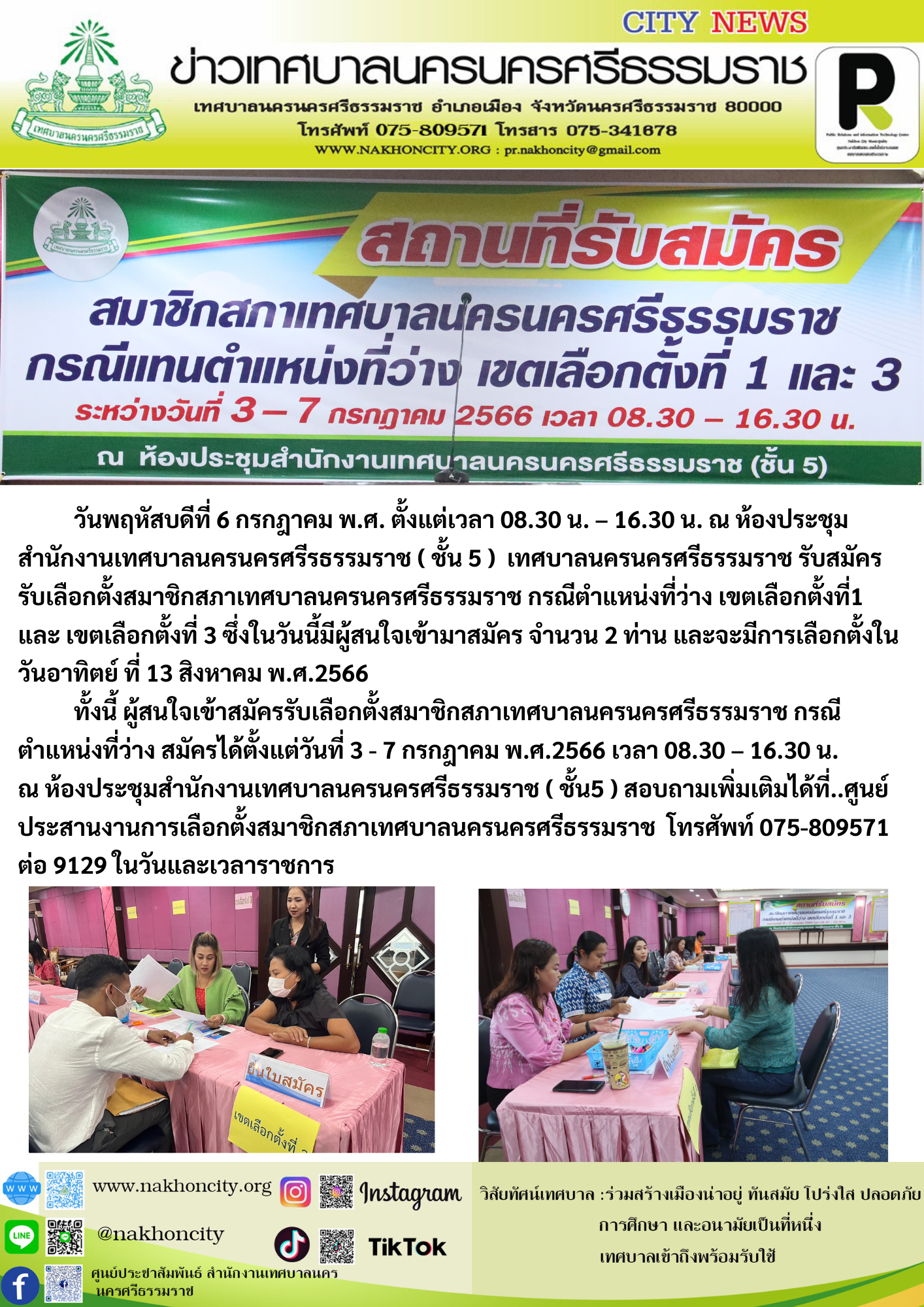 เทศบาลนครนครศรีธรรมราช รับสมัครรับเลือกตั้งสมาชิกสภาเทศบาลนครนครศรีธรรมราช กรณีตำแหน่งที่ว่าง เขตเลือกตั้งที่1 และ เขตเลือกตั้งที่ 3 |
