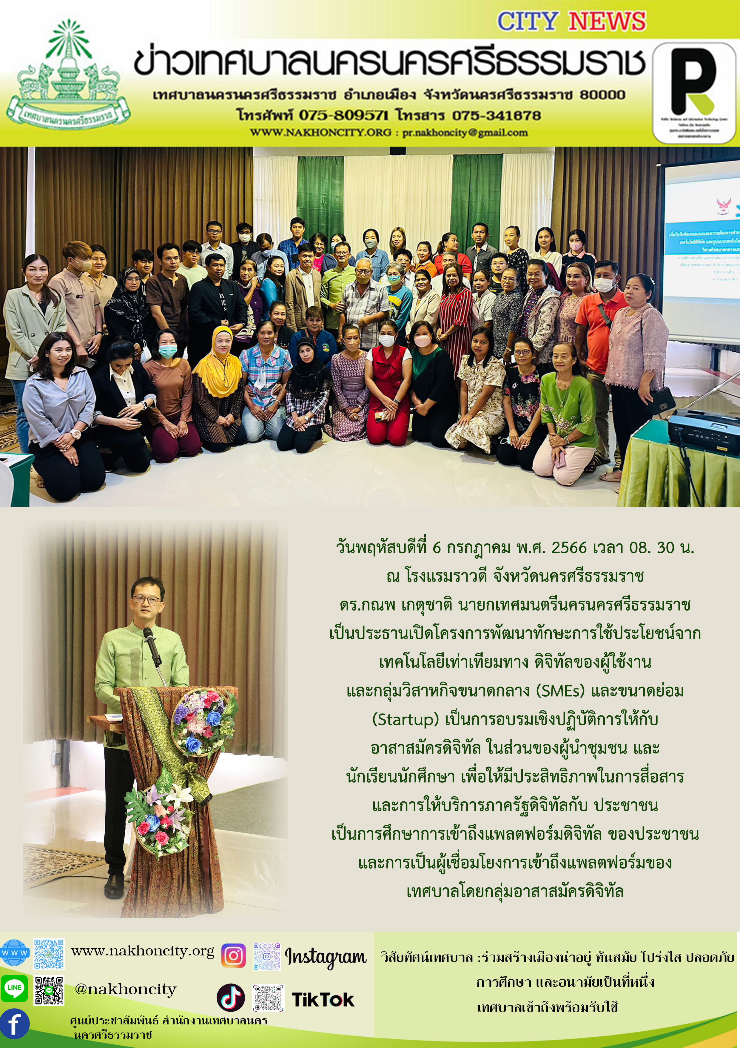 ดร.กณพ เกตุชาติ นายกเทศมนตรีนครนครศรีธรรมราช เป็นประธานเปิดโครงการพัฒนาทักษะการใช้ประโยชน์จากเทคโนโลยีเท่าเทียมทาง ดิจิทัลของผู้ใช้งาน และกลุ่มวิสาหกิจขนาดกลาง (SMEs) และขนาดย่อม (Startup) |
