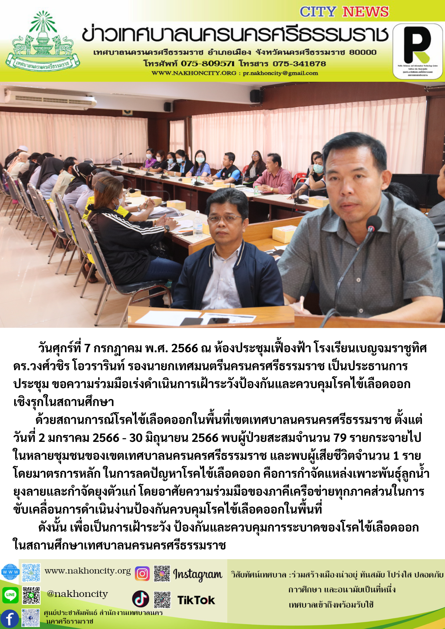 วันศุกร์ที่ 7 กรกฎาคม พ.ศ. 2566 ณ ห้องประชุมเฟื้องฟ้า โรงเรียนเบญจมราชูทิศ ดร.วงศ์วชิร โอวรารินท์ รองนายกเทศมนตรีนครนครศรีธรรมราช เป็นประธานการประชุม ขอความร่วมมือเร่งดำเนินการเฝ้าระวังป้องกันและควบคุมโรคไข้เลือดออกเชิงรุกในสถานศึกษา ด้วยสถานการณ์โรคไข้เลือดออกในพื้นที่เขตเทศบาลนครนครศรีธรรมราช ตั้งแต่วันที่ 2 มกราคม 2566 - 30 มิถุนายน 2566 พบผู้ป่วยสะสมจำนวน 79 รายกระจายไปในหลายชุมชนของเขตเทศบาลนครนครศรีธรรมราช และพบผู้เสียชีวิตจำนวน 1 ราย โดยมาตรการหลัก ในการลดปัญหาโรคไข้เลือดออก คือการกำจัดแหล่งเพาะพันธุ์ลูกน้ำยุงลายและกำจัดยุงตัวแก่ โดยอาศัยความร่วมมือของภาคีเครือข่ายทุกภาคส่วนในการขับเคลื่อนการดำเนินง่านป้องกันควบคุมโรคไข้เลือดออกในพื้นที่ ดังนั้น เพื่อเป็นการเฝ้าระวัง ป้องกันและควบคุมการระบาดของโรคไข้เลือดออกในสถานศึกษาเทศบาลนครนครศรีธรรมราช |
