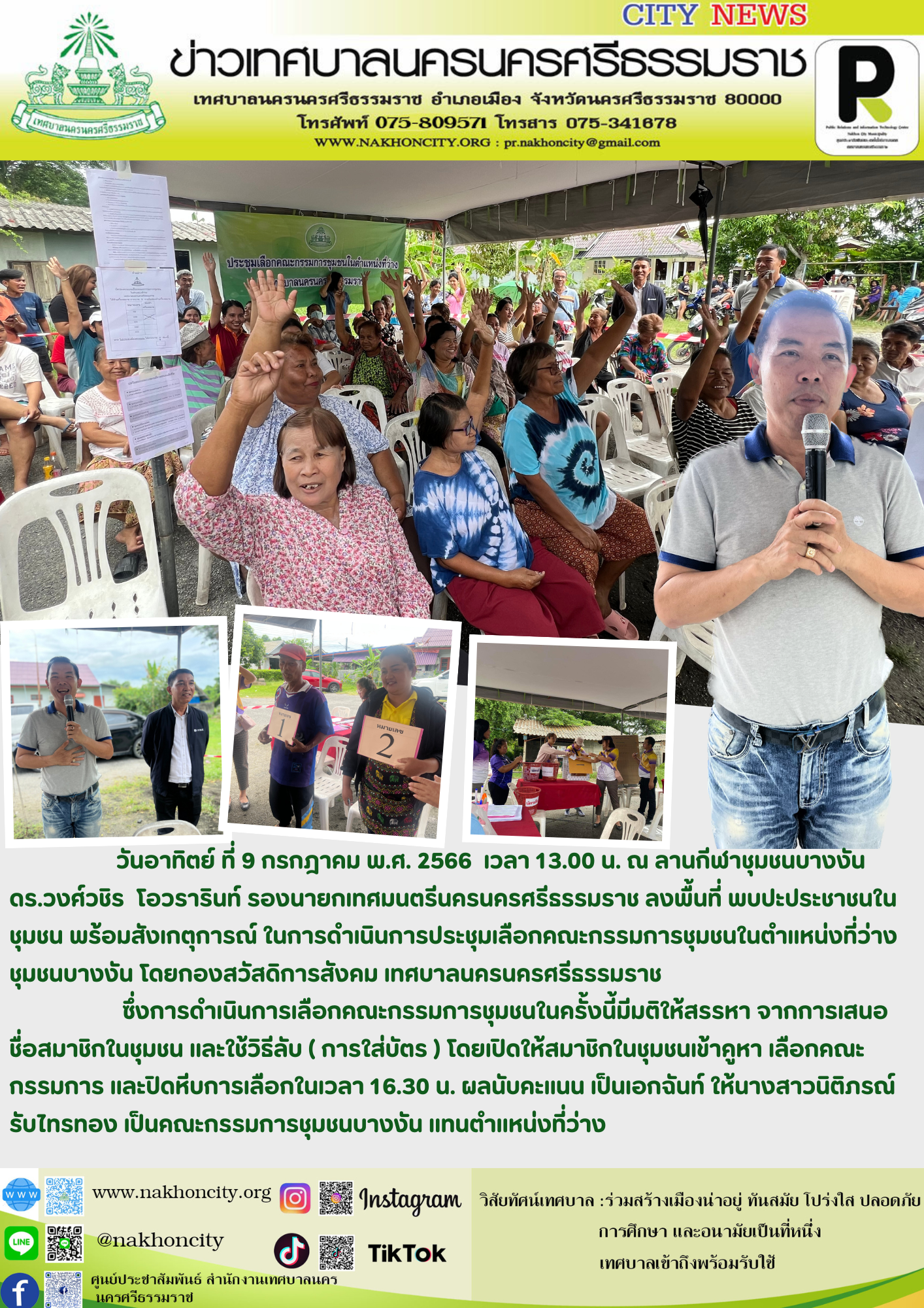 วันอาทิตย์ ที่ 9 กรกฎาคม พ.ศ. 2566 เวลา 13.00 น. ณ ลานกีฬาชุมชนบางงัน ดร.วงศ์วชิร โอวรารินท์ รองนายกเทศมนตรีนครนครศรีธรรมราช ลงพื้นที่ พบปะประชาชนในชุมชน พร้อมสังเกตุการณ์ ในการดำเนินการประชุมเลือกคณะกรรมการชุมชนในตำแหน่งที่ว่าง ชุมชนบางงัน โดยกองสวัสดิการสังคม เทศบาลนครนครศรีธรรมราช ซึ่งการดำเนินการเลือกคณะกรรมการชุมชนในครั้งนี้มีมติให้สรรหา จากการเสนอชื่อสมาชิกในชุมชน และใช้วิธีลับ ( การใส่บัตร ) โดยเปิดให้สมาชิกในชุมชนเข้าคูหา เลือกคณะกรรมการ และปิดหีบการเลือกในเวลา 16.30 น. ผลนับคะแนน เป็นเอกฉันท์ ให้นางสาวนิติภรณ์ รับไทรทอง เป็นคณะกรรมการชุมชนบางงัน แทนตำแหน่งที่ว่าง |