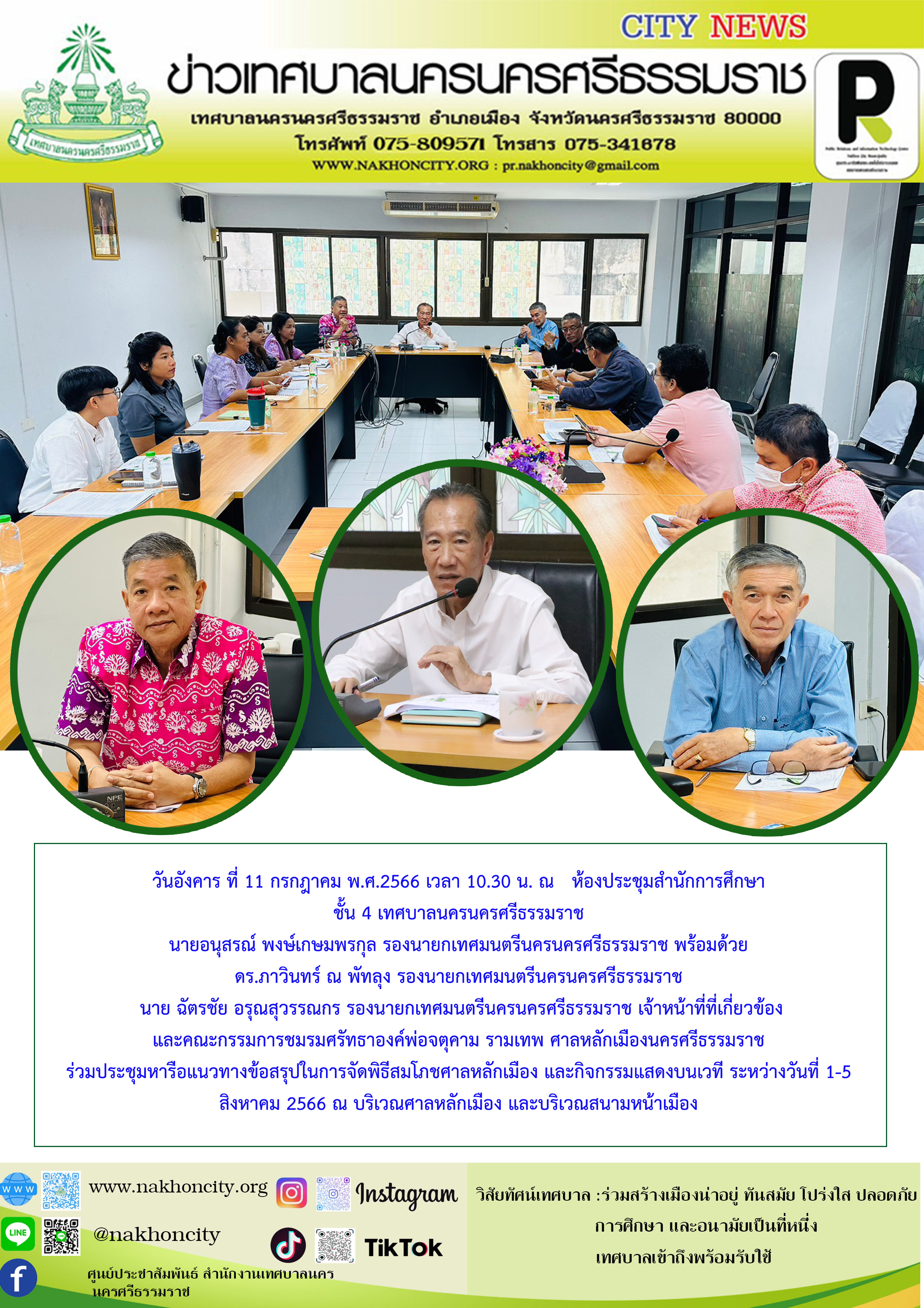 นายอนุสรณ์ พงษ์เกษมพรกุล รองนายกเทศมนตรีนครนครศรีธรรมราช พร้อมด้วย ดร.ภาวินทร์ ณ พัทลุง รองนายกเทศมนตรีนครนครศรีธรรมราช นาย ฉัตรชัย อรุณสุวรรณกร รองนายกเทศมนตรีนครนครศรีธรรมราช เจ้าหน้าที่ที่เกี่ยวข้อง และคณะกรรมการชมรมศรัทธาองค์พ่อจตุคาม รามเทพ ศาลหลักเมืองนครศรีธรรมราช ร่วมประชุมหารือแนวทางข้อสรุปในการจัดพิธีสมโภชศาลหลักเมือง และกิจกรรมแสดงบนเวที ระหว่างวันที่ 1-5 สิงหาคม 2566 ณ บริเวณศาลหลักเมือง และบริเวณสนามหน้าเมือง |