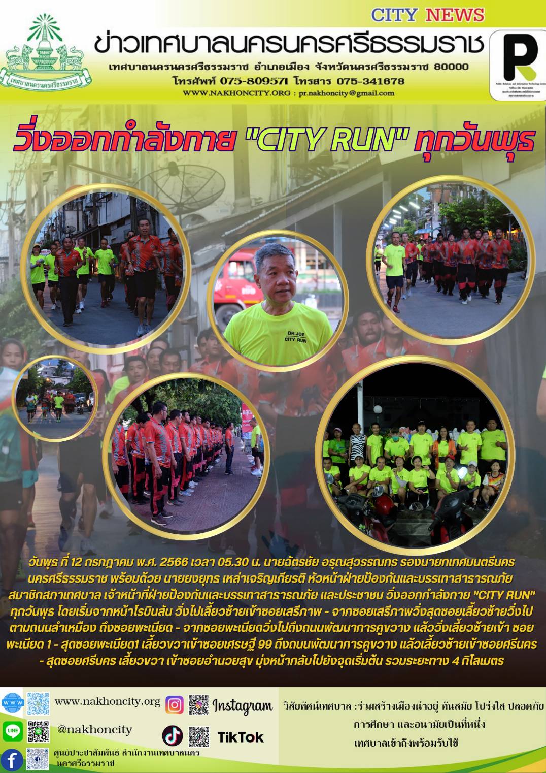 วันพุธ ที่ 12 กรกฎาคม พ.ศ. 2566 เวลา 05.30 น. นายฉัตรชัย อรุณสุวรรณกร รองนายกเทศมนตรีนครนครศรีธรรมราช พร้อมด้วย นายยงยุทธ เหล่าเจริญเกียรติ หัวหน้าฝ่ายป้องกันและบรรเทาสาธารณภัย สมาชิกสภาเทศบาล เจ้าหน้าที่ฝ่ายป้องกันและบรรเทาสาธารณภัย และประชาชน วิ่งออกกำลังกาย "CITY RUN" ทุกวันพุธ โดยเริ่มจากหน้าโรบินสัน วิ่งไปเลี้ยวซ้ายเข้าซอยเสรีภาพ - จากซอยเสรีภาพวิ่งสุดซอยเลี้ยวซ้ายวิ่งไปตามถนนลำเหมือง ถึงซอยพะเนียด - จากซอยพะเนียดวิ่งไปถึงถนนพัฒนาการคูขวาง แล้ววิ่งเลี้ยวซ้ายเข้า ซอยพะเนียด 1 - สุดซอยพะเนียด1 เลี้ยวขวาเข้าซอยเศรษฐี 99 ถึงถนนพัฒนาการคูขวาง แล้วเลี้ยวซ้ายเข้าซอยศรีนคร - สุดซอยศรีนคร เลี้ยวขวา เข้าซอยอำนวยสุข มุ่งหน้ากลับไปยังจุดเริ่มต้น รวมระยะทาง 4 กิโลเมตร ................ ภาพ//ข่าว//จันทร์จิรา |