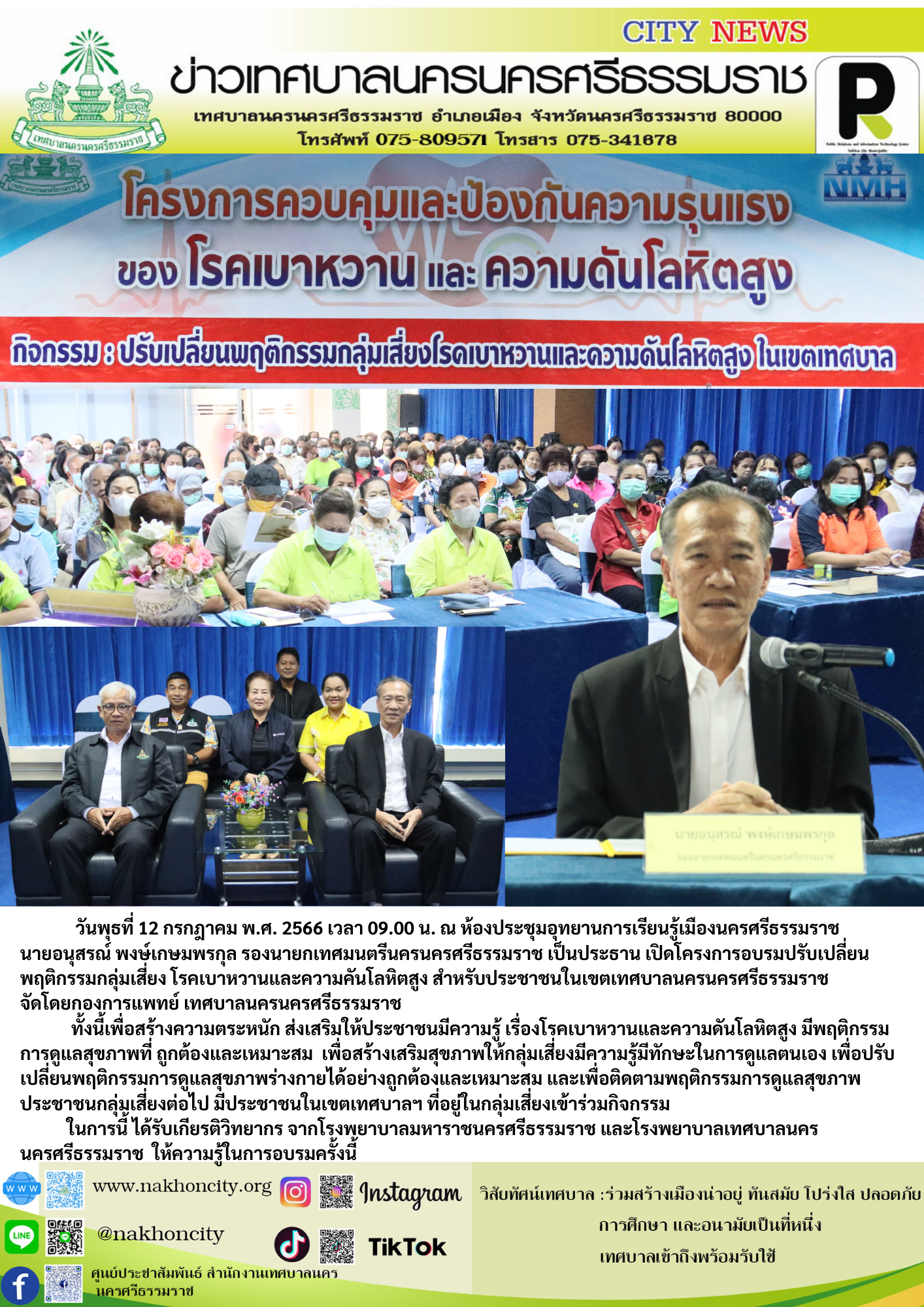 นายอนุสรณ์ พงษ์เกษมพรกุล รองนายกเทศมนตรีนครนครศรีธรรมราช เป็นประธาน เปิดโครงการอบรมปรับเปลี่ยนพฤติกรรมกลุ่มเสี่ยง โรคเบาหวานและความคันโลหิตสูง สำหรับประชาชนในเขตเทศบาลนครนครศรีธรรมราช |