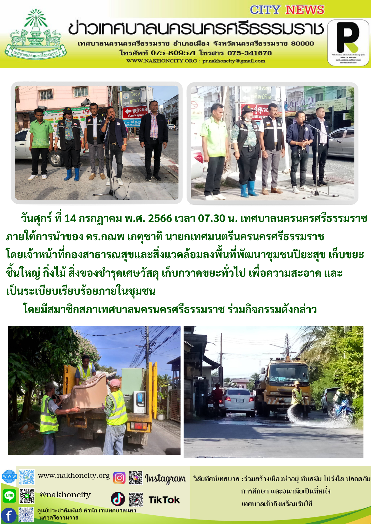 วันศุกร์ ที่ 14 กรกฎาคม พ.ศ. 2566 เวลา 07.30 น. เทศบาลนครนครศรีธรรมราช ภายใต้การนำของ ดร.กณพ เกตุชาติ นายกเทศมนตรีนครนครศรีธรรมราช โดยเจ้าหน้าที่กองสาธารณสุขและสิ่งแวดล้อมลงพื้นที่พัฒนาชุมชนปิยะสุข เก็บขยะชิ้นใหญ่ กิ่งไม้ สิ่งของชำรุดเศษวัสดุ เก็บกวาดขยะทั่วไป เพื่อความสะอาด และเป็นระเบียบเรียบร้อยภายในชุมชน โดยมีสมาชิกสภาเทศบาลนครนครศรีธรรมราช ร่วมกิจกรรมดังกล่าว