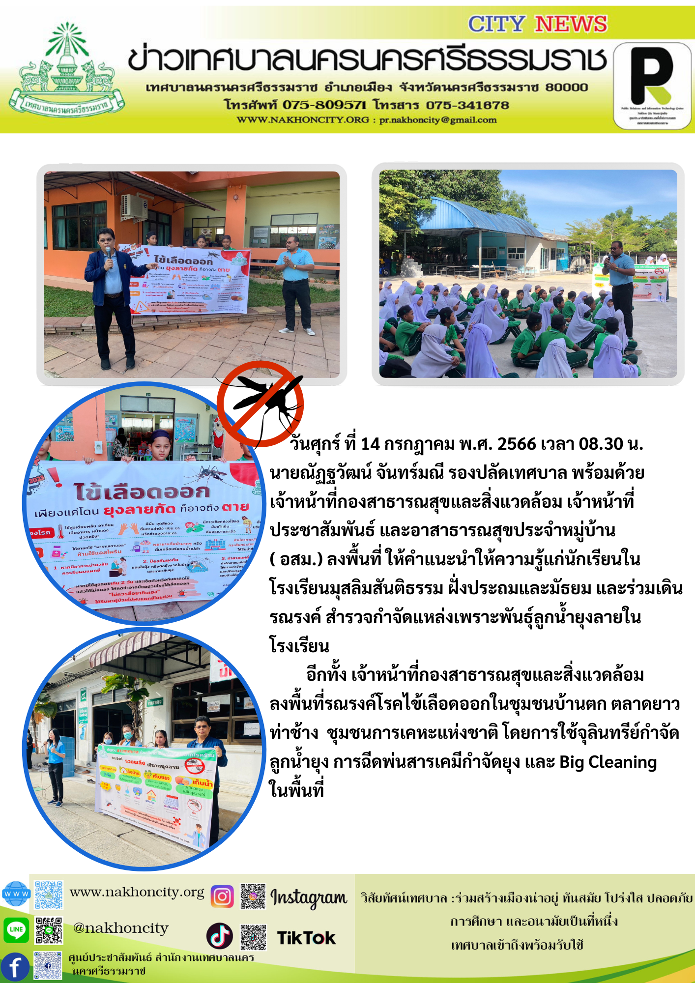 วันศุกร์ ที่ 14 กรกฎาคม พ.ศ. 2566 เวลา 08.30 น. นายณัฏฐวัฒน์ จันทร์มณี รองปลัดเทศบาล พร้อมด้วย กองสาธารณสุขและสิ่งแวดล้อม เจ้าหน้าที่ประชาสัมพันธ์ และอาสาธารณสุขประจำหมู่บ้าน ( อสม.) ลงพื้นที่ ให้คำแนะนำให้ความรู้แก่นักเรียนในโรงเรียนมุสลิมสันติธรรม ฝั่งประถมและมัธยม และร่วมเดินรณรงค์ สำรวจกำจัดแหล่งเพราะพันธุ์ลูกน้ำยุงลายในโรงเรียน อีกทั้ง เจ้าหน้าที่กองสาธารณสุขและสิ่งแวดล้อม ลงพื้นที่ณรงค์โรคไข้เลือดออกในชุมชนบ้านตก ตลาดยาว ท่าช้าง ชุมชนการเคหะแห่งชาติ โดยการใช้จุลินทรีย์กำจัดลูกน้ำยุง การฉีดพ่นสารเคมีกำจัดยุง และ Big Cleaning ในพื้นที่