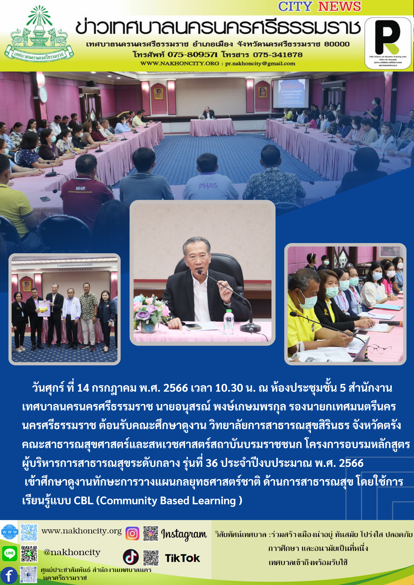วันศุกร์ ที่ 14 กรกฎาคม พ.ศ. 2566 เวลา 10.30 น. ณ ห้องประชุมชั้น 5 สำนักงานเทศบาลนครนครศรีธรรมราช นายอนุสรณ์ พงษ์เกษมพรกุล รองนายกเทศมนตรีนครนครศรีธรรมราช ต้อนรับคณะศึกษาดูงาน วิทยาลัยการสาธารณสุขสิรินธร จังหวัดตรัง คณะสาธารณสุขศาสตร์และสหเวชศาสตร์สถาบันบรมราชชนก โครงการอบรมหลักสูตร ผู้บริหารการสาธารณสุขระดับกลาง รุ่นที่ 36 ประจำปีงบประมาณ พ.ศ. 2566 เข้าศึกษาดูงานทักษะการวางแผนกลยุทธศาสตร์ชาติ ด้านการสาธารณสุข โดยใช้การเรียนรู้แบบ CBL (Community Based Learning )