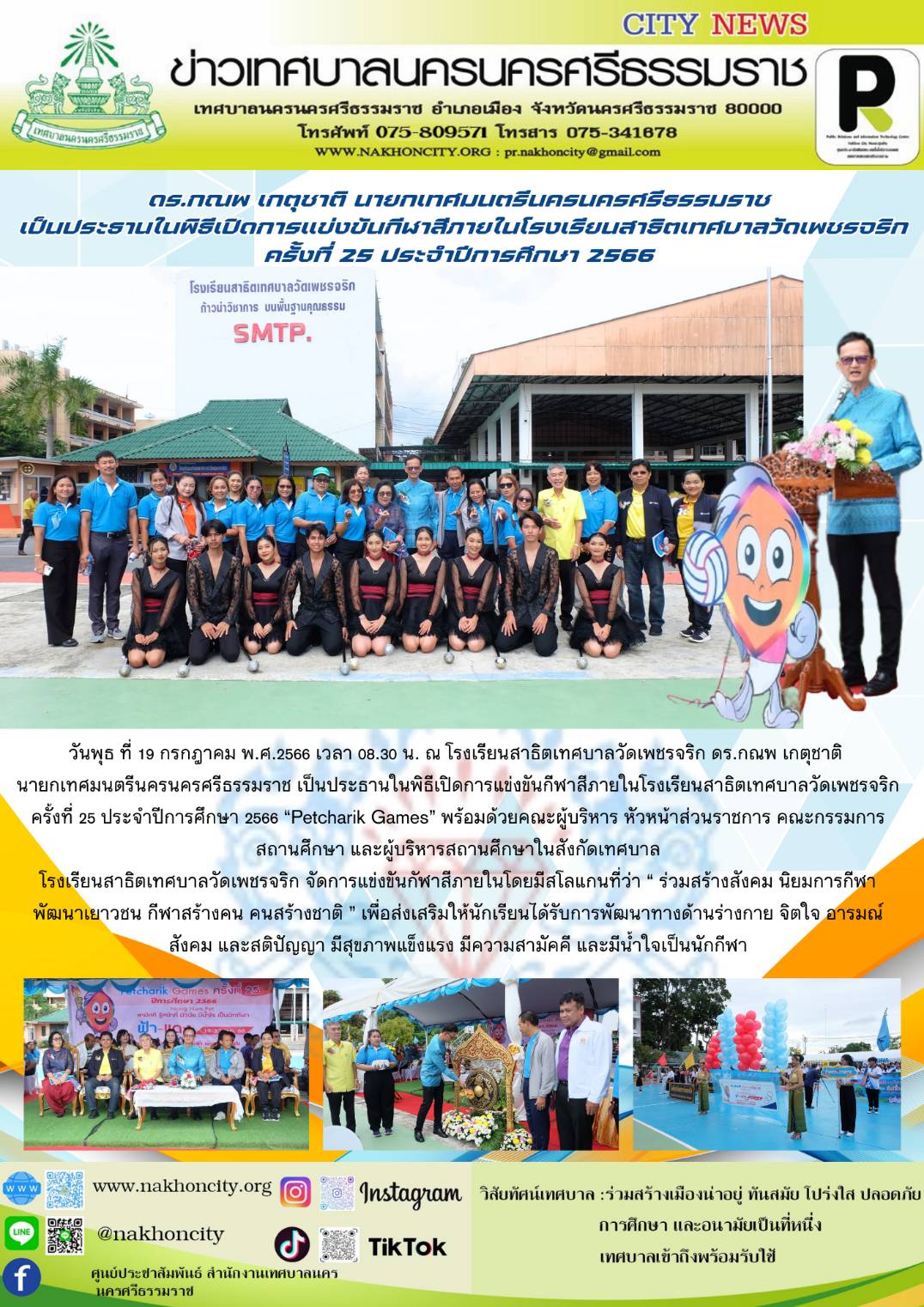 ดร.กณพ เกตุชาติ นายกเทศมนตรีนครนครศรีธรรมราช เป็นประธานในพิธีเปิดการแข่งขันกีฬาสีภายในโรงเรียนสาธิตเทศบาลวัดเพชรจริก ครั้งที่ 25 ประจำปีการศึกษา 2566 “Petcharik Games” |
