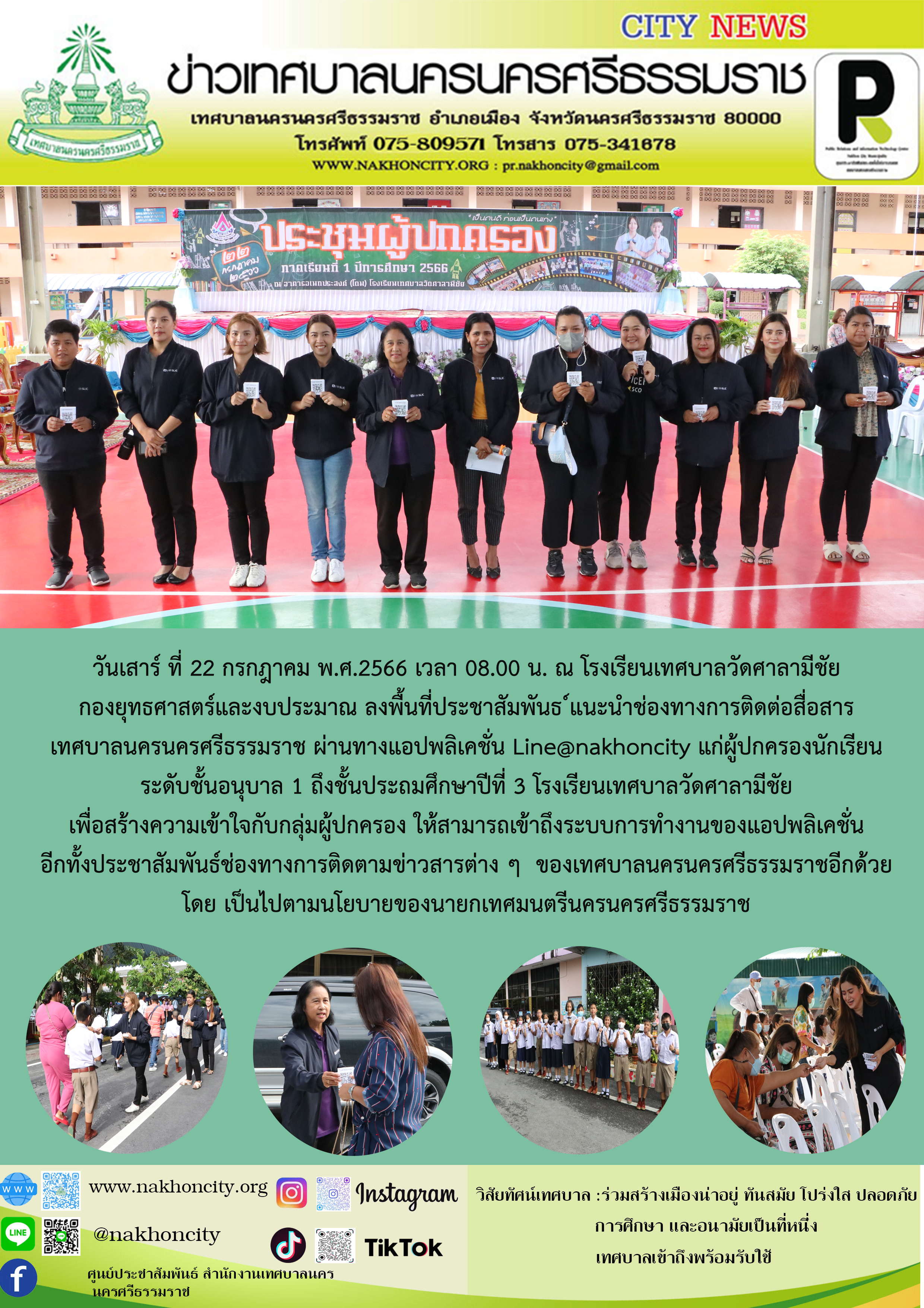 กองยุทธศาสตร์และงบประมาณ ลงพื้นที่ประชาสัมพันธ์แนะนำช่องทางการติดต่อสื่อสาร เทศบาลนครนครศรีธรรมราช ผ่านทางแอปพลิเคชั่น Line@nakhoncity แก่ผู้ปกครองนักเรียน ระดับชั้นอนุบาล 1 ถึงชั้นประถมศึกษาปีที่ 3 โรงเรียนเทศบาลวัดศาลามีชัย |