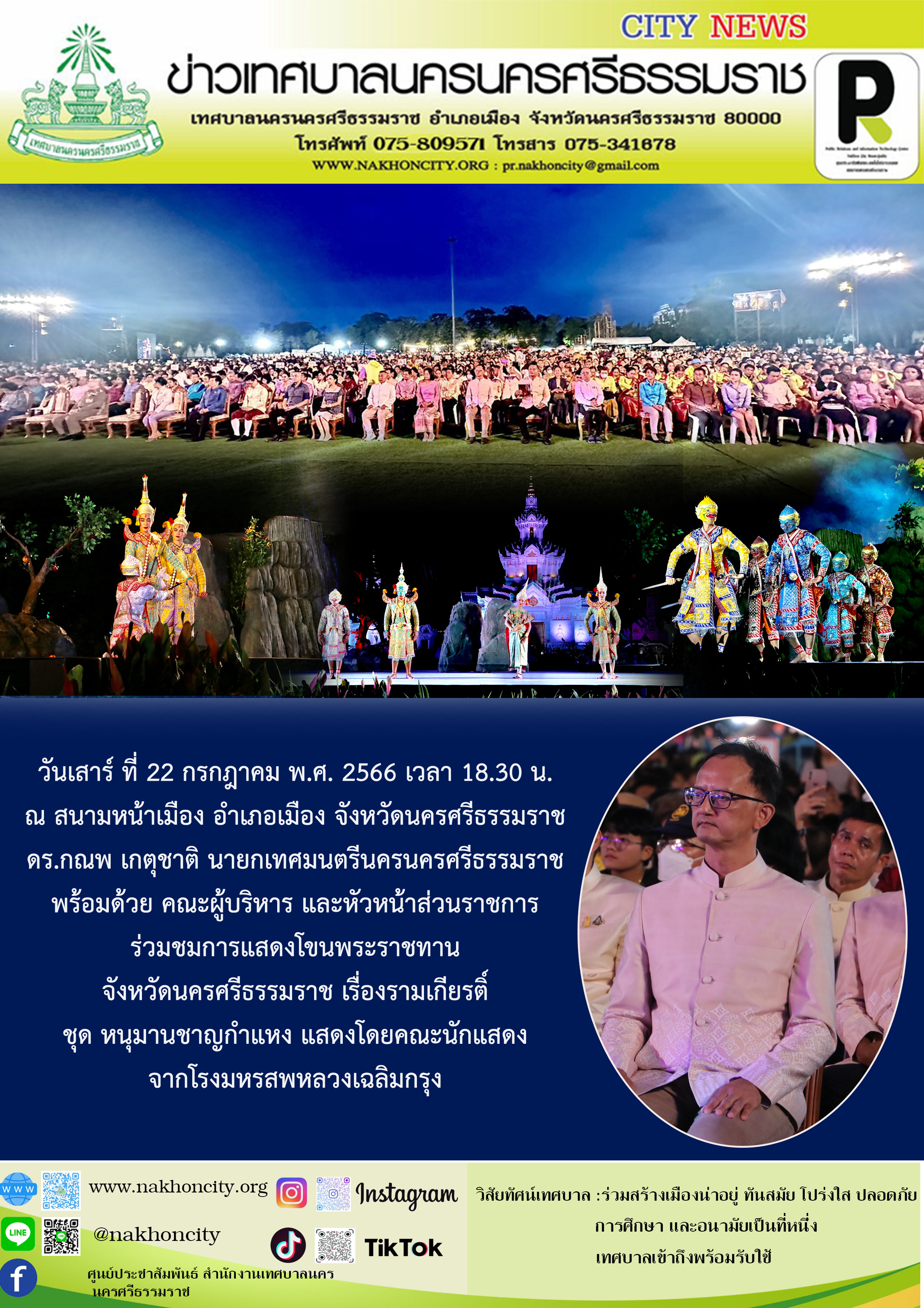 ดร.กณพ เกตุชาติ นายกเทศมนตรีนครนครศรีธรรมราช พร้อมด้วย คณะผู้บริหาร และหัวหน้าส่วนราชการ ร่วมชมการแสดงโขนพระราชทาน จังหวัดนครศรีธรรมราช เรื่องรามเกียรติ์ ชุด หนุมานชาญกำแหง |