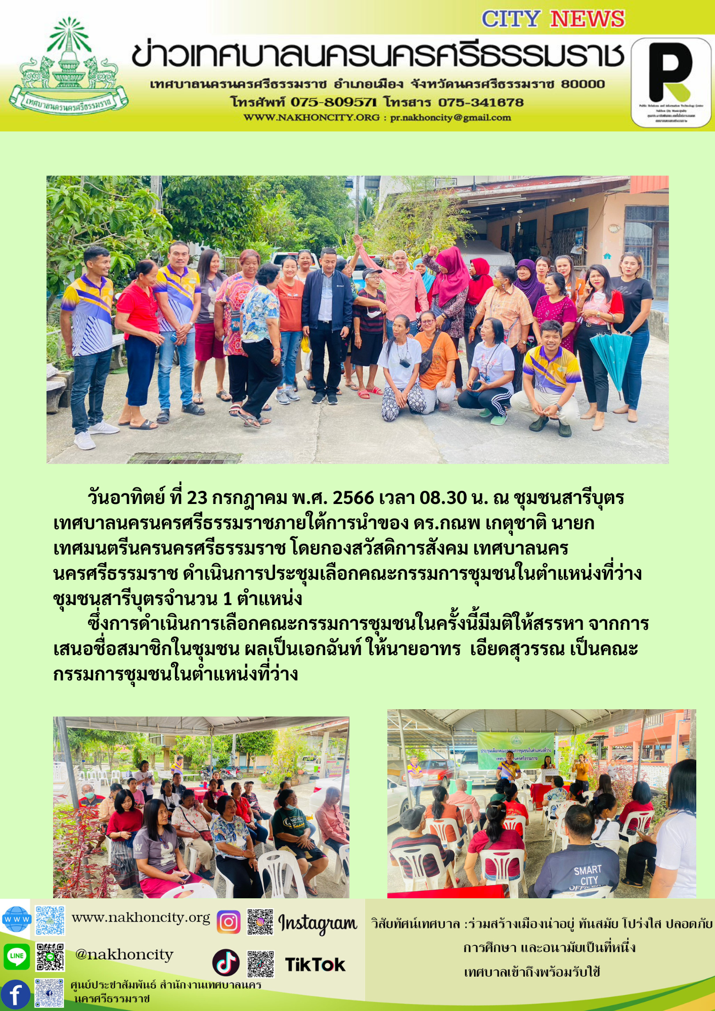 วันอาทิตย์ ที่ 23 กรกฎาคม พ.ศ. 2566 เวลา 08.30 น. ณ ชุมชนสารีบุตร เทศบาลนครนครศรีธรรมราชภายใต้การนำของ ดร.กณพ เกตุชาติ นายกเทศมนตรีนครนครศรีธรรมราช โดยกองสวัสดิการสังคม เทศบาลนครนครศรีธรรมราช ดำเนินการประชุมเลือกคณะกรรมการชุมชนในตำแหน่งที่ว่าง ชุมชนสารีบุตรจำนวน 1 ตำแหน่ง ซึ่งการดำเนินการเลือกคณะกรรมการชุมชนในครั้งนี้มีมติให้สรรหา จากการเสนอชื่อสมาชิกในชุมชน ผลเป็นเอกฉันท์ ให้นายอาทร เอียดสุวรรณ เป็นคณะกรรมการชุมชนในตำแหน่งที่ว่าง |