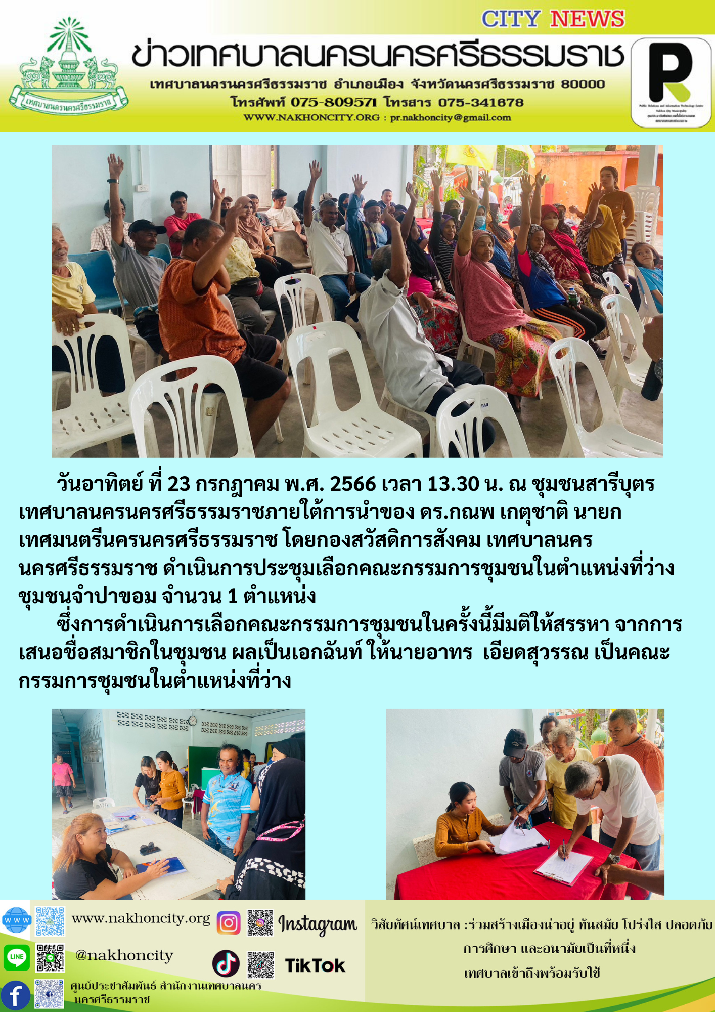 วันอาทิตย์ ที่ 23 กรกฎาคม พ.ศ. 2566 เวลา 13.30 น. ณ ชุมชนจำปาขอม เทศบาลนครนครศรีธรรมราชภายใต้การนำของ ดร.กณพ เกตุชาติ นายกเทศมนตรีนครนครศรีธรรมราช โดยกองสวัสดิการสังคม เทศบาลนครนครศรีธรรมราช ดำเนินการประชุมเลือกคณะกรรมการชุมชนในตำแหน่งที่ว่าง จำนวน 1 ตำแหน่ง ซึ่งการดำเนินการเลือกคณะกรรมการชุมชนในครั้งนี้มีมติให้สรรหา จากการเสนอชื่อสมาชิกในชุมชน และใช้วิธีเปิดเผย ( ยกมือ ) |