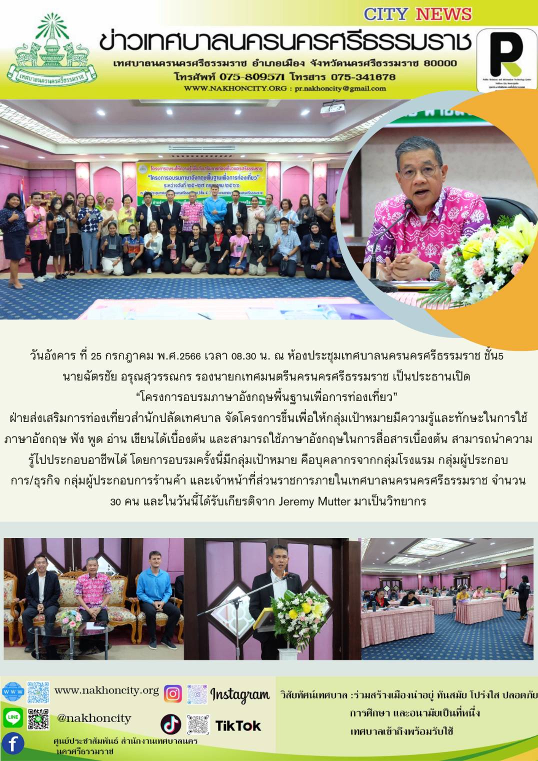 วันอังคาร ที่ 25 กรกฎาคม พ.ศ.2566 เวลา 08.30 น. ณ ห้องประชุมเทศบาลนครนครศรีธรรมราช ชั้น5 นายฉัตรชัย อรุณสุวรรณกร รองนายกเทศมนตรีนครนครศรีธรรมราช เป็นประธานเปิด “โครงการอบรมภาษาอังกฤษพื้นฐานเพื่อการท่องเที่ยว” พร้อมด้วยคณะผู้บริหาร หัวหน้าส่วนราชการ ฝ่ายส่งเสริมการท่องเที่ยวสำนักปลัดเทศบาล จัดโครงการขึ้นเพื่อให้กลุ่มเป้าหมายมีความรู้และทักษะในการใช้ภาษาอังกฤษ ฟัง พูด อ่าน เขียนได้เบื้องต้น และสามารถใช้ภาษาอังกฤษในการสื่อสารเบื้องต้น สามารถนำความรู้ไปประกอบอาชีพได้ โดยการอบรมครั้งนี้มีกลุ่มเป้าหมาย คือบุคลากรจากกลุ่มโรงแรม กลุ่มผู้ประกอบการ/ธุรกิจ กลุ่มผู้ประกอบการร้านค้า และเจ้าหน้าที่ส่วนราชการภายในเทศบาลนครนครศรีธรรมราช จำนวน 30 คน และในวันนี้ได้รับเกียรติจาก Jeremy Mutter มาเป็นวิทยากร ............. ภาพ//ข่าว//จันทร์จิรา |