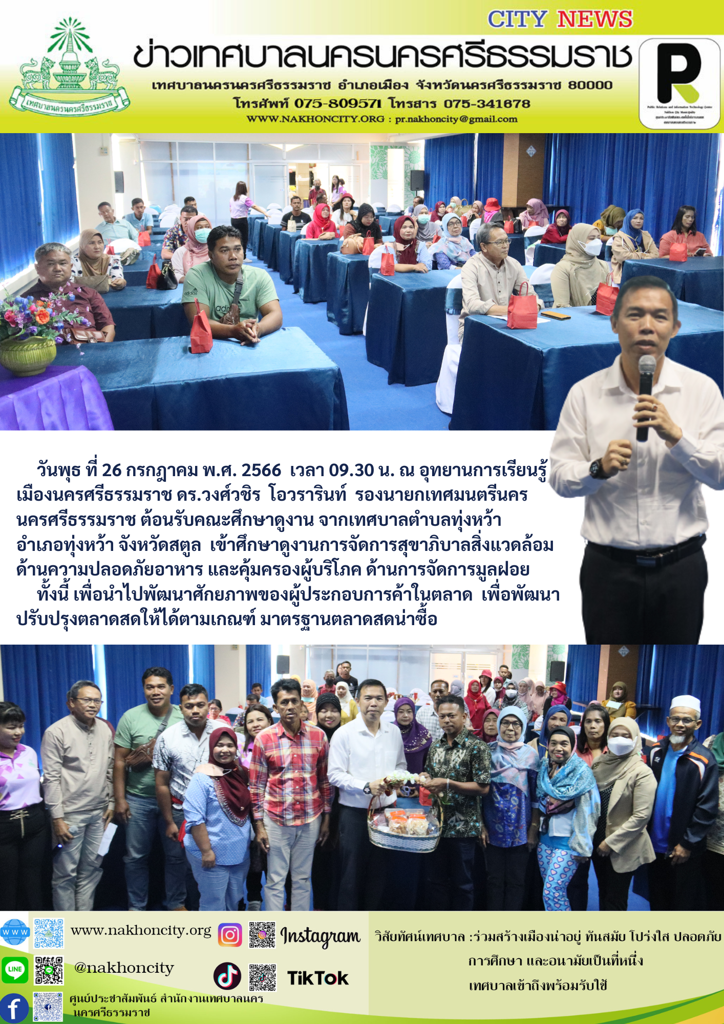 วันพุธ ที่ 26 กรกฎาคม พ.ศ. 2566 เวลา 09.30 น. ณ อุทยานการเรียนรู้เมืองนครศรีธรรมราช ดร.วงศ์วชิร โอวรารินท์ รองนายกเทศมนตรีนครนครศรีธรรมราช ต้อนรับคณะศึกษาดูงาน จากเทศบาลตำบลทุ่งหว้า อำเภอทุ่งหว้า จังหวัดสตูล เข้าศึกษาดูงานการจัดการสุขาภิบาลสิ่งแวดล้อม ด้านความปลอดภัยอาหาร และคุ้มครองผู้บริโภค ด้านการจัดการมูลฝอย |