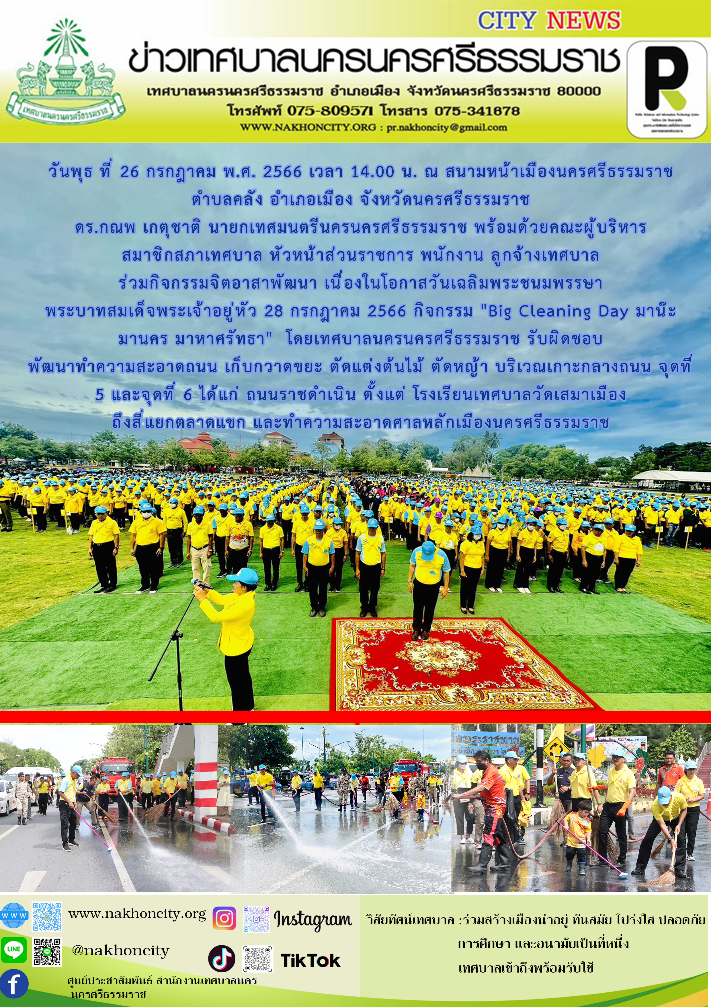 ดร.กณพ เกตุชาติ นายกเทศมนตรีนครนครศรีธรรมราช พร้อมด้วยคณะผู้บริหาร สมาชิกสภาเทศบาล หัวหน้าส่วนราชการ พนักงาน ลูกจ้างเทศบาล ร่วมกิจกรรมจิตอาสาพัฒนา เนื่องในโอกาสวันเฉลิมพระชนมพรรษา พระบาทสมเด็จพระเจ้าอยู่หัว 28 กรกฎาคม 2566 กิจกรรม "Big Cleaning Day มาน๊ะ มานคร มาหาศรัทธา" |