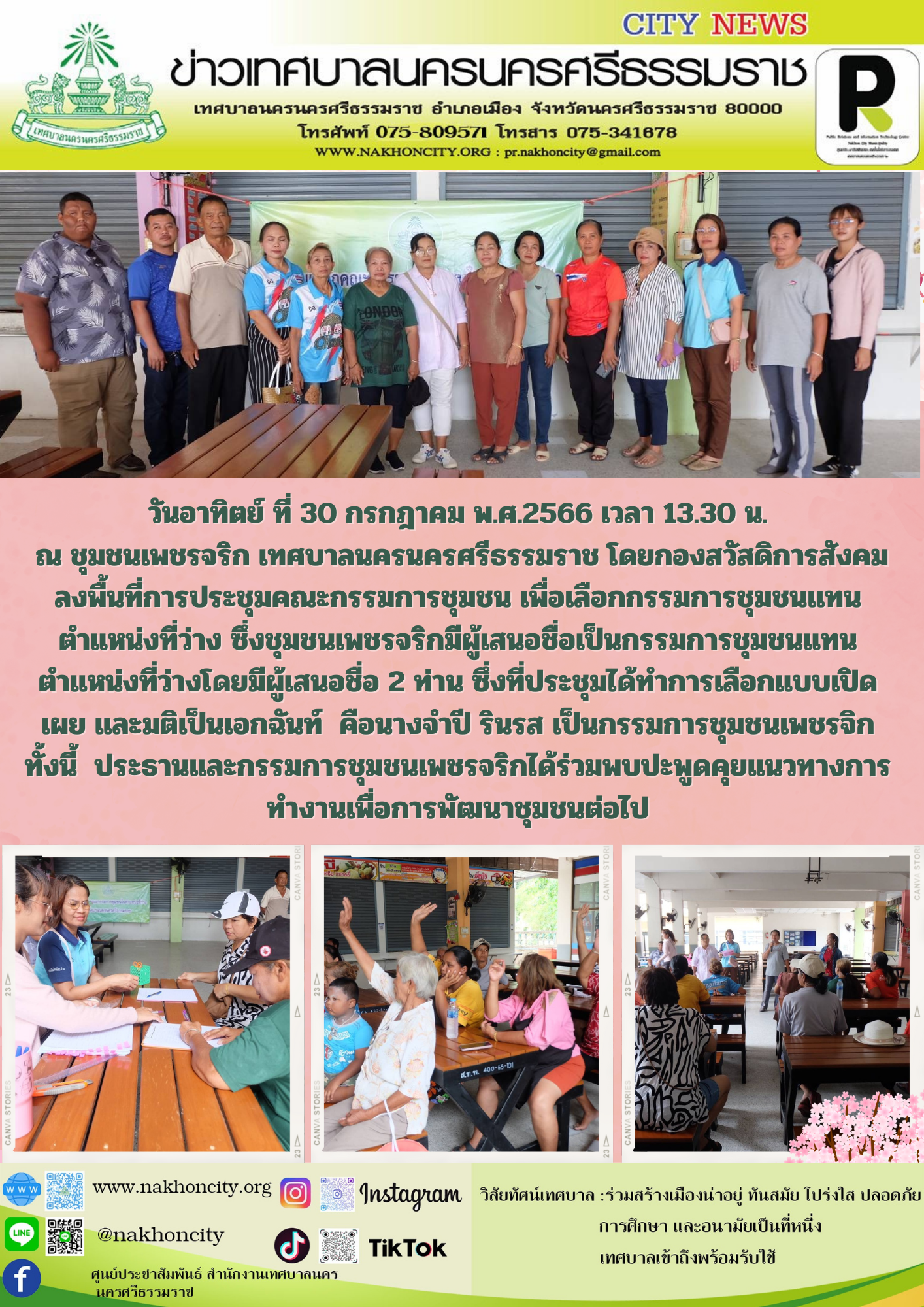 เทศบาลนครนครศรีธรรมราช โดยกองสวัสดิการสังคม ลงพื้นที่การประชุมคณะกรรมการชุมชนเพชรจริก เพื่อเลือกกรรมการชุมชนแทนตำแหน่งที่ว่าง |