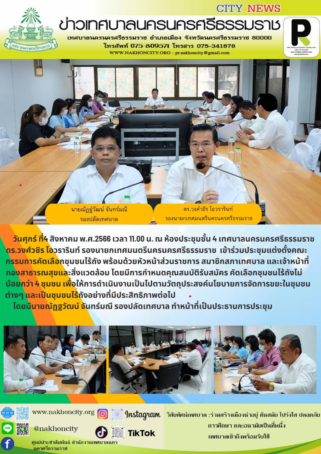 วันศุกร์ ที่4 สิงหาคม พ.ศ.2566 เวลา 11.00 น. ณ ห้องประชุมชั้น 4 เทศบาลนครนครศรีธรรมราช ดร.วงศ์วชิร โอวรารินท์ รองนายกเทศมนตรีนครนครศรีธรรมราช เข้าร่วมประชุมแต่งตั้งคณะกรรมการคัดเลือกชุมชนไร้ถัง พร้อมด้วยหัวหน้าส่วนราชการ สมาชิกสภาเทศบาล และเจ้าหน้าที่กองสาธารณสุขและสิ่งแวดล้อม โดยมีการกำหนดคุณสมบัติรับสมัคร คัดเลือกชุมชนไร้ถังไม่น้อยกว่า 4 ชุมชน เพื่อให้การดำเนินงานเป็นไปตามวัตถุประสงค์นโยบายการจัดการขยะในชุมชนต่างๆ และเป็นชุมชนไร้ถังอย่างที่มีประสิทธิภาพต่อไป |