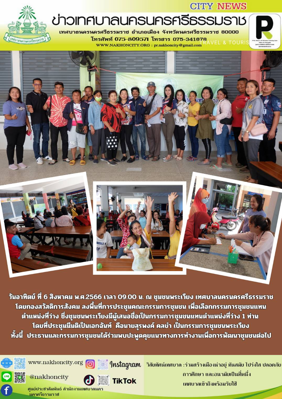 วันอาทิตย์ ที่ 6 สิงหาคม พ.ศ.2566 เวลา 09.00 น. ณ ชุมชนพระเวียง เทศบาลนครนครศรีธรรมราช โดยกองสวัสดิการสังคม ลงพื้นที่การประชุมคณะกรรมการชุมชน เพื่อเลือกกรรมการชุมชนแทนตำแหน่งที่ว่าง ซึ่งชุมชนพระเวียงมีผู้เสนอชื่อเป็นกรรมการชุมชนแทนตำแหน่งที่ว่าง 1 ท่าน โดยที่ประชุมมีมติเป็นเอกฉันท์ คือนายสุรพงค์ คลขำ เป็นกรรมการชุมชนพระเวียง |