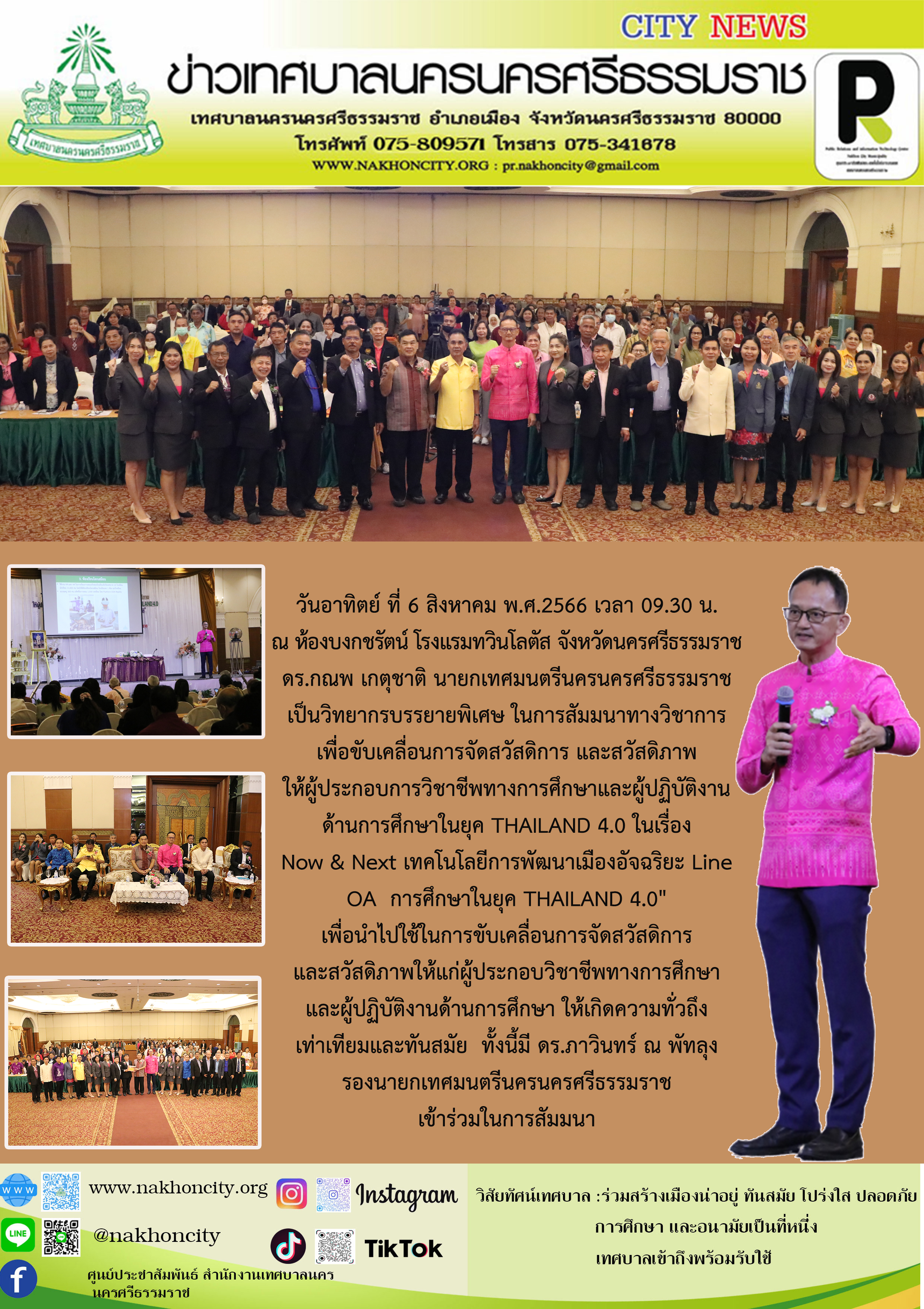 ดร.กณพ เกตุชาติ นายกเทศมนตรีนครนครศรีธรรมราช เป็นวิทยากรบรรยายพิเศษ ในการสัมมนาทางวิชาการ เพื่อขับเคลื่อนการจัดสวัสดิการ และสวัสดิภาพให้ผู้ประกอบการวิชาชีพทางการศึกษาและผู้ปฏิบัติงานด้านการศึกษาในยุค THAILAND 4.0 ในเรื่อง Now & Next เทคโนโลยีการพัฒนาเมืองอัจฉริยะ Line OA การศึกษาในยุค THAILAND 4.0" |