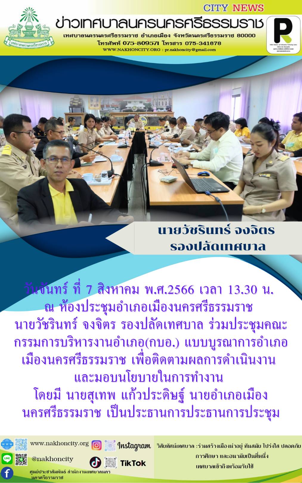 วันจันทร์ ที่ 7 สิงหาคม พ.ศ.2566 เวลา 13.30 น. ณ ห้องประชุมอำเภอเมืองนครศรีธรรมราช นายวัชรินทร์ จงจิตร รองปลัดเทศบาล ร่วมประชุมคณะกรรมการบริหารงานอำเภอ(กบอ.) แบบบูรณาการอำเภอเมืองนครศรีธรรมราช เพื่อติดตามผลการดำเนินงาน และมอบนโยบายในการทำงาน โดยมี นายสุเทพ แก้วประดิษฐ์ นายอำเภอเมืองนครศรีธรรมราช เป็นประธานการประชุม |