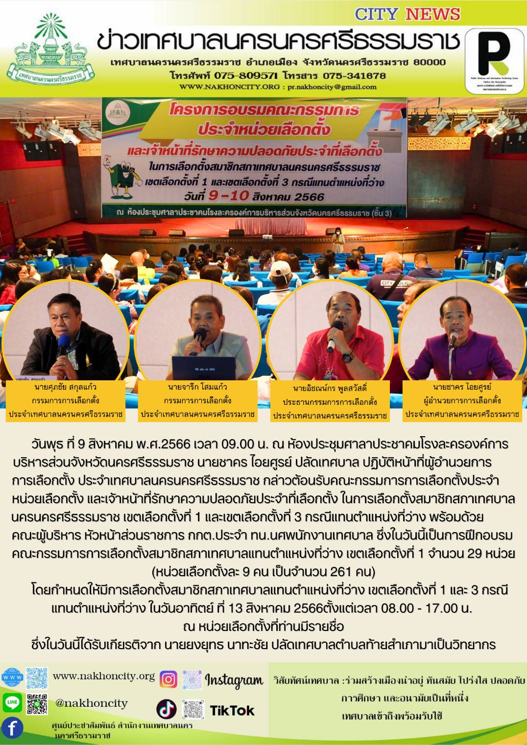 วันพุธ ที่ 9 สิงหาคม พ.ศ.2566 เวลา 09.00 น. ณ ห้องประชุมศาลาประชาคมโรงละครองค์การบริหารส่วนจังหวัดนครศรีธรรมราช นายชาคร ไอยศูรย์ ปลัดเทศบาล ปฏิบัติหน้าที่ผู้อำนวยการการเลือกตั้ง ประจำเทศบาลนครนครศรีธรรมราช กล่าวต้อนรับคณะกรรมการการเลือกตั้งประจำหน่วยเลือกตั้ง และเจ้าหน้าที่รักษาความปลอดภัยประจำที่เลือกตั้ง ในการเลือกตั้งสมาชิกสภาเทศบาลนครนครศรีธรรมราช เขตเลือกตั้งที่ 1 และเขตเลือกตั้งที่ 3 กรณีแทนตำแหน่งที่ว่าง พร้อมด้วย คณะผู้บริหาร หัวหน้าส่วนราชการ กกต.ประจำ ทน.นศ พนักงานเทศบาล ซึ่งในวันนี้เป็นการฝึกอบรมคณะกรรมการการเลือกตั้งสมาชิกสภาเทศบาลแทนตำแหน่งที่ว่าง เขตเลือกตั้งที่ 1 จำนวน 29 หน่วย (หน่วยเลือกตั้งละ 9 คน เป็นจำนวน 261 คน) โดยกำหนดให้มีการเลือกตั้งสมาชิกสภาเทศบาลแทนตำแหน่งที่ว่าง เขตเลือกตั้งที่ 1 และ 3 กรณีแทนตำแหน่งที่ว่าง ในวันอาทิตย์ ที่ 13 สิงหาคม 2566 ตั้งแต่เวลา 08.00 - 17.00 น. ณ หน่วยเลือกตั้งที่ท่านมีรายชื่อ ซึ่งในวันนี้ได้รับเกียรติจาก นายยงยุทธ นาทะชัย ปลัดเทศบาลตำบลท้ายสำเภามาเป็นวิทยากร ................ ภาพ//ข่าว//จันทร์จิรา ตรวจทาน//ฐิตินันท์ |