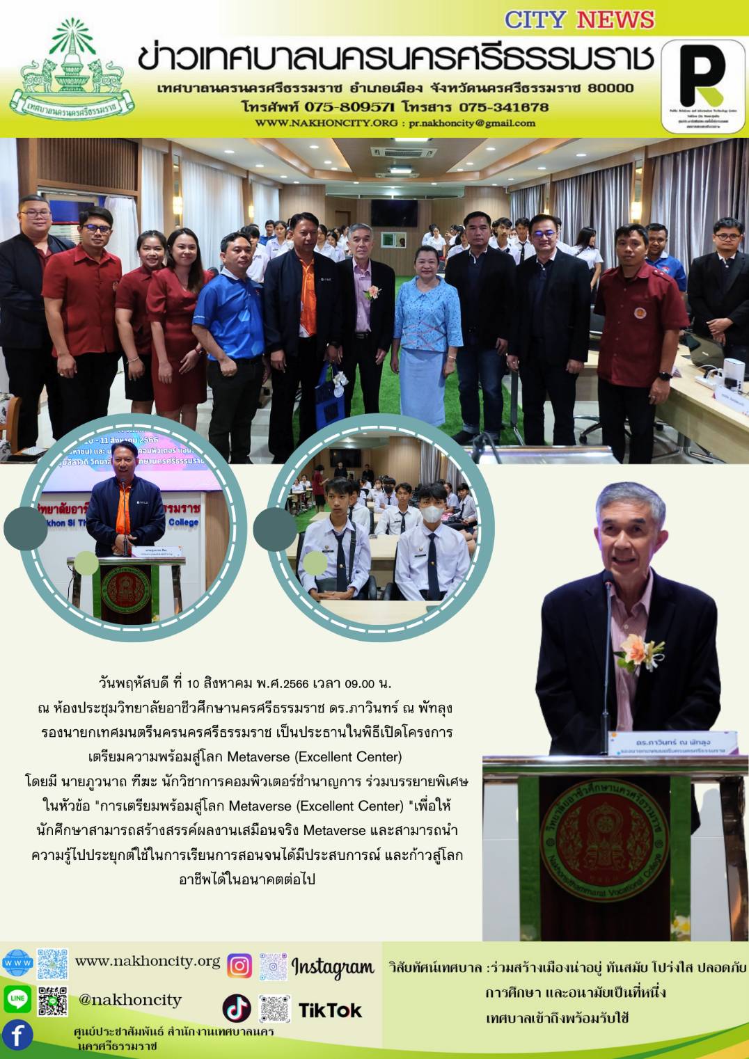 วันพฤหัสบดี ที่ 10 สิงหาคม พ.ศ.2566 เวลา 09.00 น. ณ ห้องประชุมวิทยาลัยอาชีวศึกษานครศรีธรรมราช ดร.ภาวินทร์ ณ พัทลุง รองนายกเทศมนตรีนครนครศรีธรรมราช เป็นประธานในพิธีเปิดโครงการเตรียมความพร้อมสู่โลก Metaverse (Excellent Center) |