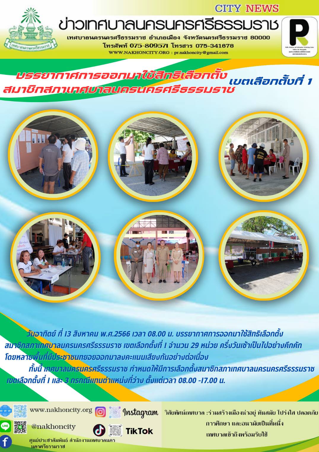 วันอาทิตย์ ที่ 13 สิงหาคม พ.ศ.2566 เวลา 08.00 น. บรรยากาศการออกมาใช้สิทธิเลือกตั้งสมาชิกสภาเทศบาลนครนครศรีธรรมราช เขตเลือกตั้งที่ 1 จำนวน 29 หน่วย ครึ่งวันเช้าเป็นไปอย่างคึกคัก โดยหลายพื้นที่มีประชาชนทยอยออกมาลงคะแนนเสียงกันอย่างต่อเนื่อง ทั้งนี้ เทศบาลนครนครศรีธรรมราช กำหนดให้มีการเลือกตั้งสมาชิกสภาเทศบาลนครนครศรีธรรมราช เขตเลือกตั้งที่ 1 และ 3 กรกณีแทนตำแหน่งที่ว่าง ตั้งแต่เวลา 08.00 -17.00 น. ............. ภาพ//ข่าว//จันทร์จิรา ตรวจทาน//ฐิตินันท์ |