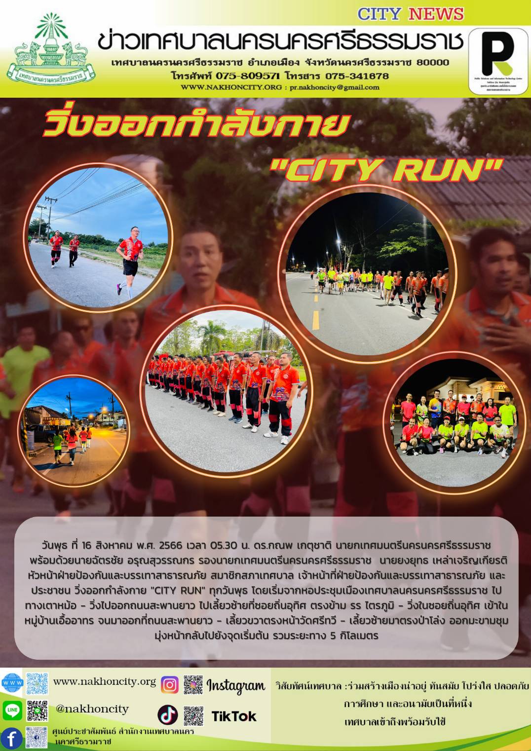วันพุธ ที่ 16 สิงหาคม พ.ศ. 2566 เวลา 05.30 น. ดร.กณพ เกตุชาติ นายกเทศมนตรีนครนครศรีธรรมราช พร้อมด้วยนายฉัตรชัย อรุณสุวรรณกร รองนายกเทศมนตรีนครนครศรีธรรมราช นายยงยุทธ เหล่าเจริญเกียรติ หัวหน้าฝ่ายป้องกันและบรรเทาสาธารณภัย สมาชิกสภาเทศบาล เจ้าหน้าที่ฝ่ายป้องกันและบรรเทาสาธารณภัย และประชาชน วิ่งออกกำลังกาย "CITY RUN" ทุกวันพุธ โดยเริ่มจากหอประชุมเมืองเทศบาลนครนครศรีธรรมราช ไปทางเตาหม้อ - วิ่งไปออกถนนสะพานยาว ไปเลี้ยวซ้ายที่ซอยถิ่นอุทิศ ตรงข้าม รร ไตรภูมิ - วิ่งในซอยถิ่นอุทิศ เข้าในหมู่บ้านเอื้ออาทร จนมาออกที่ถนนสะพานยาว - เลี้ยวขวาตรงหน้าวัดศรีทวี - เลี้ยวซ้ายมาตรงป่าโล่ง ออกมะขามชุม มุ่งหน้ากลับไปยังจุดเริ่มต้น รวมระยะทาง 4 กิโลเมตร |