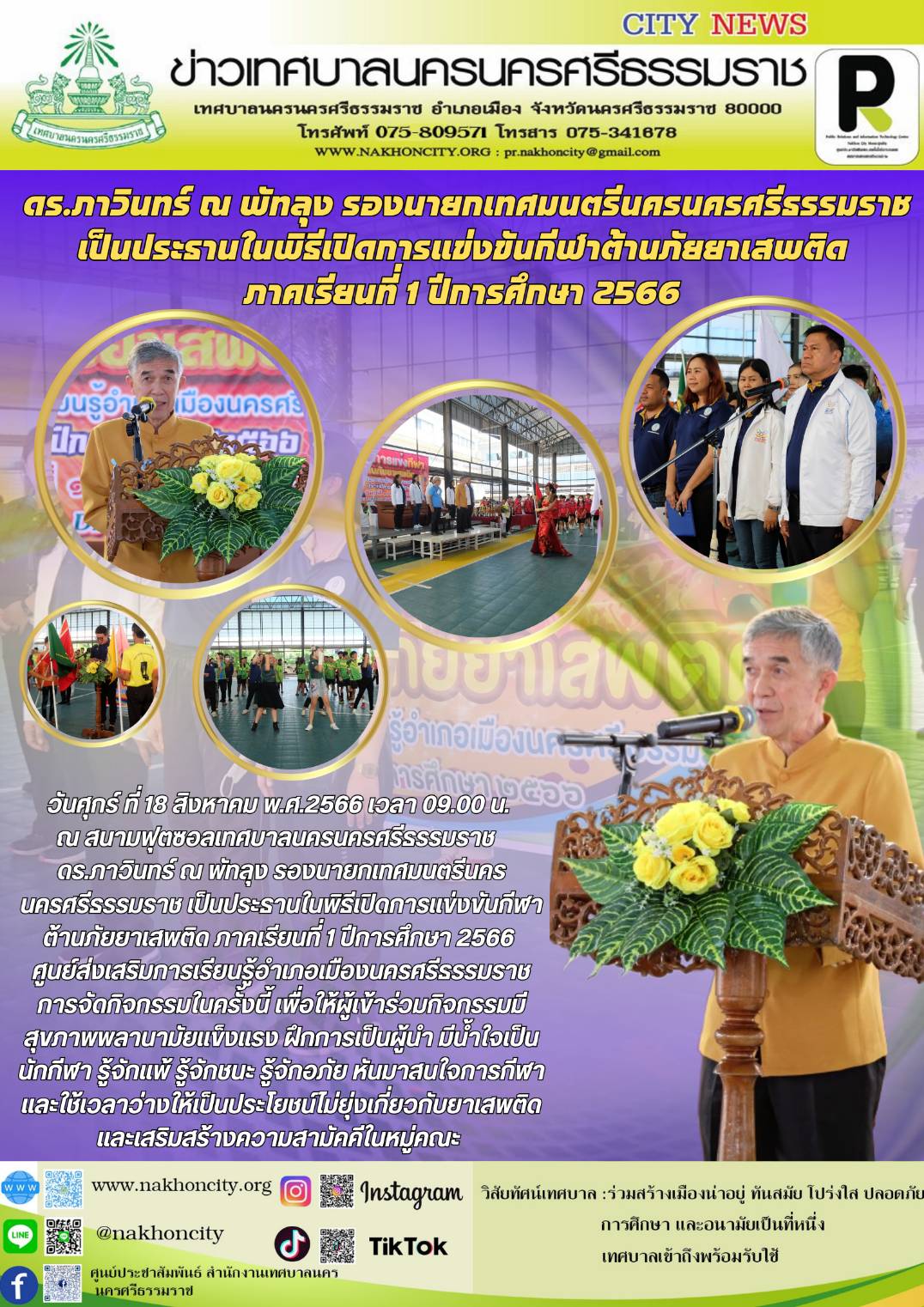 ดร.ภาวินทร์ ณ พัทลุง รองนายกเทศมนตรีนครนครศรีธรรมราช เป็นประธานในพิธีเปิดการแข่งขันกีฬาต้านภัยยาเสพติด ภาคเรียนที่ 1 ปีการศึกษา 2566 |