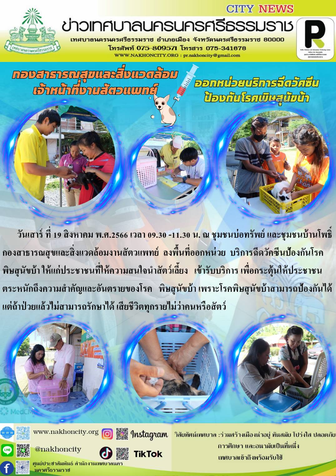 วันเสาร์ ที่ 19 สิงหาคม พ.ศ.2566 เวลา 09.30 -11.30 น. ณ ชุมชนบ่อทรัพย์ และชุมชนบ้านโพธิ์ กองสาธารณสุขและสิ่งแวดล้อมงานสัตวแพทย์ ลงพื้นที่ออกหน่วยบริการฉีดวัคซีนป้องกันโรคพิษสุนัขบ้า ให้แก่ประชาชนที่ให้ความสนใจนำสัตว์เลี้ยงเข้ารับบริการ เพื่อกระตุ้นให้ประชาชนตระหนักถึงความสำคัญและอันตรายของโรคพิษสุนัขบ้า เพราะโรคพิษสุนัขบ้าสามารถป้องกันได้ แต่ถ้าป่วยแล้วไม่สามารถรักษาได้ เสียชีวิตทุกรายไม่ว่าคนหรือสัตว์ |